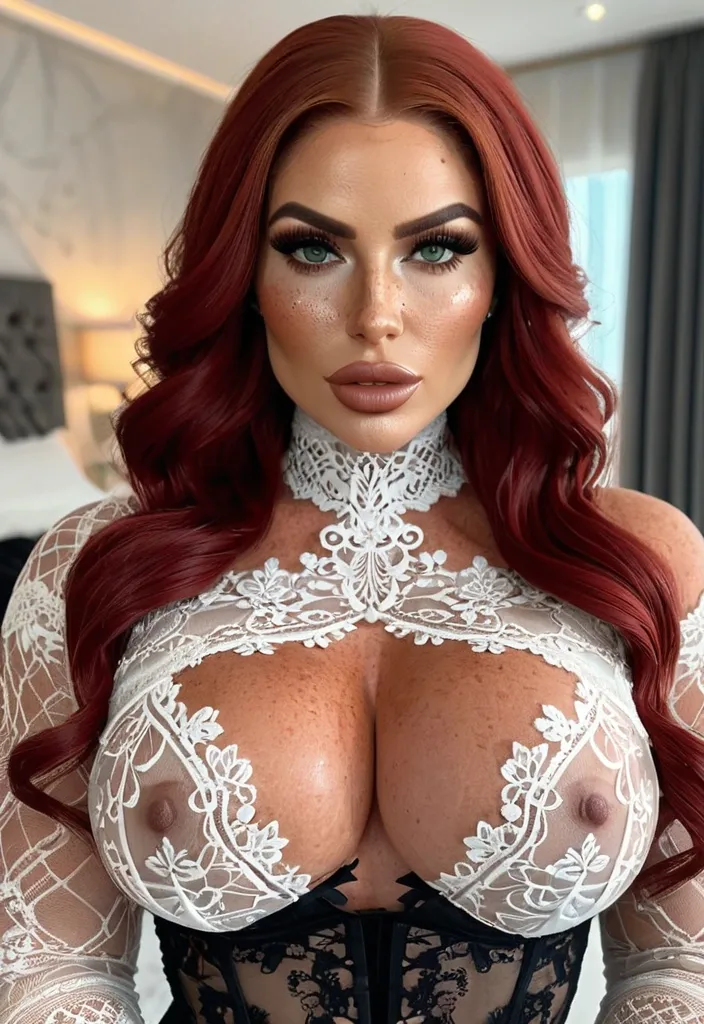 Generate Gorgeous female boss , bimbo , hourglass body , abnormally massive female bodybuilder , gorgeous , close up , full lips , big booty , redheaded , freckles on face and breast , braided design hair , feminine silhouette , too big breast , big booty , sexy thighs abs , silhouette , up close , flexing biceps , beautiful green eyes , legs are iconic and defining physical feature , both visually and in terms of combat ability.wearing an outfit that is a striking blend of elegance , power , and femininity , designed to command attention in any room. The suit is tailored to perfection , hugging the wearer’s curves with precision while emphasizing a structured silhouette. The fabric itself is a refined grey tweed patterned with subtle white grid lines , giving the suit a texture that feels both sophisticated and modern. The blazer features broad blue lapels and gold button accents , adding a luxurious touch that elevates the look beyond typical business attire. The matching high-waisted trousers elongate the frame , further enhancing the poised and commanding effect of the ensemble.The styling choices amplify the boldness of the suit. The inner blouse is a silky , greybutton-down shirt that complements the tweed’s tone while introducing a softer , feminine balance to the sharp tailoring of the jacket. The blouse peeks out neatly from under the blazer , maintaining elegance without drawing focus away from the suit’s commanding cut. Accessories are kept minimal yet intentional: a delicate layered gold necklace and hoop earrings that add glimmers of light and luxury without overpowering the outfit. The choice of voluminous , honey-brown braids cascading down her shoulders frames the face with both confidence and glamour , completing the commanding visual.Altogether , this look communicates a blend of authority and allure. It is business-ready yet fashion-forward , balancing corporate structure with vibrant femininity. The color palette blue , grey and gold avoids being overly delicate , instead embracing the richness of texture , structure , and presence. This is the kind of ensemble that speaks to ambition , sophistication , and personal style—ideal for someone who thrives in positions of influence but insists on expressing her individuality with bold elegance. It’s not just clothing—it’s a statement of power wrapped in grace. In luxury living legs that could crush a watermelon , skirt high boots are a bold and striking statement piece , crafted in glossy black patent leather that gives them a sleek , polished finish. Rising to just below the knee , the boots feature three adjustable buckle straps along the shaft , adding both edge and detail to their design. The towering stiletto heel , paired with a thick platform sole , creates an ultra-dramatic silhouette that elongates the leg and exudes power and confidence. With their combination of shine , height , and structure , these boots perfectly balance fierce femininity with high-fashion allure.The outfit is a delicate black and pearl white lace off-the-shoulder top with intricate floral patterns and scalloped edges , sheer enough to reveal skin while accentuating deep cleavage. The lace drapes softly over her chest , blending romance with sensual allure in a cozy bedroom setting.freckles , alluring big green eyes , enormous butt and breast , massive cleavage , enormous butt , up close shot ,