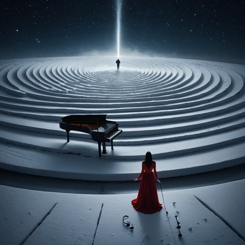 bird eye view of landscape of a lonely female play violin and standing on an infinite in red dress , smooth , pale stage under a Christmas night sky. Above the figure , an enormous piano keys like a vortex resembling a giant staircase , blending into the night sky with fine , subtle textures of stardust. The scene feels surreal , minimalist , and overwhelming in scale , with the human appearing small and fragile against the vast , silent void. Cinematic lighting , soft shadows , ethereal atmosphere , evoking existential wonder and cosmic insignificance. ,