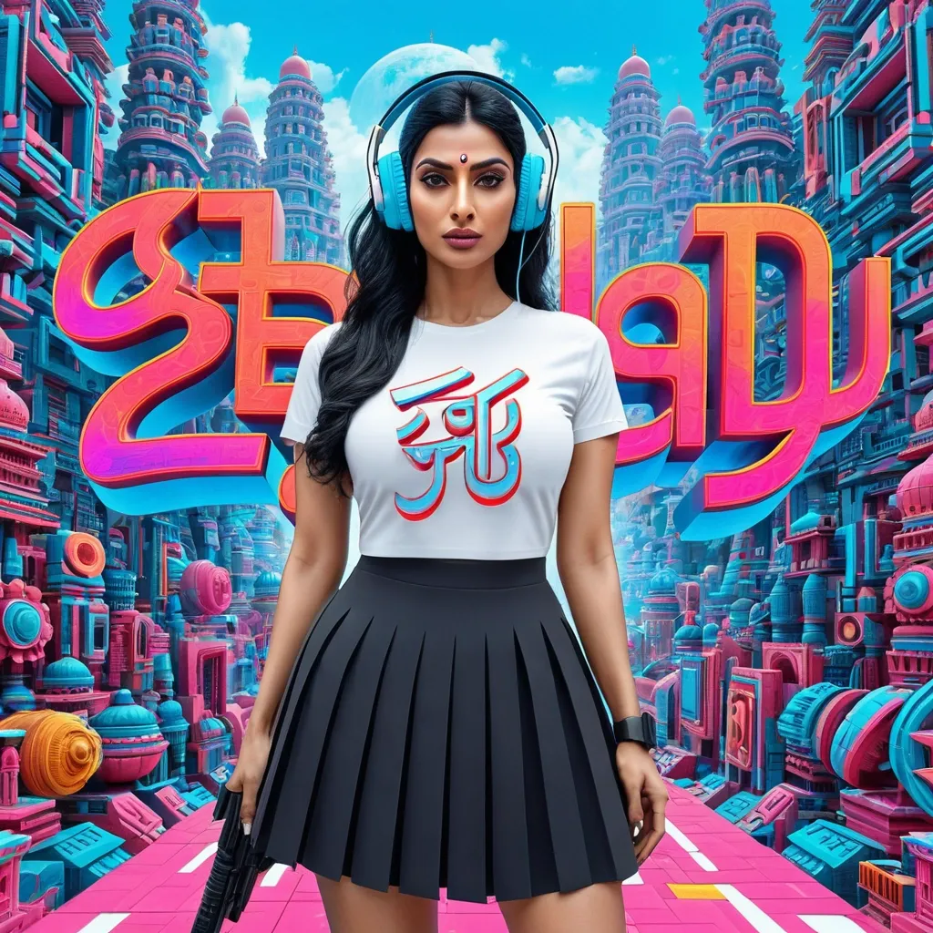 60% of the screen is completely white. There are so many text and a piece 3D things. Create a piece of minimalist and elegant modern art. A beautiful Indian woman in a Walt Disney printed t-shirt and black skirt , holding sci-fi futuristic heavy water-gun , Wearing a phenomenally elegant exceptionally modern designed , strong and vibrant colored , vivid neon pastel sky-blue pink colored headphone. All sorts of special image effects are applied to parts of the entire screen , tremendously perspective and the outlook are all fused together and expressed in true clear colors. The text is in white where it overlaps with the 3D object. The colorful background Main Typography (Center Focus) , Design bold , 3D stylized Hindi calligraphy text: “होली है” , Large , dramatic Devanagari lettering. Thick rounded strokes. or a combination of small symbols and lines. A phenomenally close-up to the unexpectedly art. The entire screen is naturally bright and dazzlingly vibrant. The high resolution and fine details are reminiscent of an electron microscope with sharp effect singularly strongest ever. ,