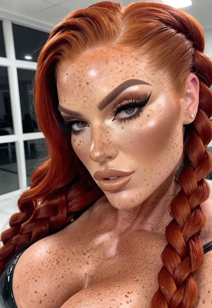 Generate Gorgeous female boss , bimbo , hourglass body , abnormally massive female bodybuilder , gorgeous , close up , full lips , big booty , redheaded , freckles on face and breast , braided design hair , feminine silhouette , too big breast , big booty , sexy thighs abs , silhouette , up close , flexing biceps , beautiful green eyes , legs are iconic and defining physical feature , both visually and in terms of combat ability.wearing an outfit that is a striking blend of elegance , power , and femininity , designed to command attention in any room. The suit is tailored to perfection , hugging the wearer’s curves with precision while emphasizing a structured silhouette. The fabric itself is a refined grey tweed patterned with subtle white grid lines , giving the suit a texture that feels both sophisticated and modern. The blazer features broad blue lapels and gold button accents , adding a luxurious touch that elevates the look beyond typical business attire. The matching high-waisted trousers elongate the frame , further enhancing the poised and commanding effect of the ensemble.The styling choices amplify the boldness of the suit. The inner blouse is a silky , greybutton-down shirt that complements the tweed’s tone while introducing a softer , feminine balance to the sharp tailoring of the jacket. The blouse peeks out neatly from under the blazer , maintaining elegance without drawing focus away from the suit’s commanding cut. Accessories are kept minimal yet intentional: a delicate layered gold necklace and hoop earrings that add glimmers of light and luxury without overpowering the outfit. The choice of voluminous , honey-brown braids cascading down her shoulders frames the face with both confidence and glamour , completing the commanding visual.Altogether , this look communicates a blend of authority and allure. It is business-ready yet fashion-forward , balancing corporate structure with vibrant femininity. The color palette blue , grey and gold avoids being overly delicate , instead embracing the richness of texture , structure , and presence. This is the kind of ensemble that speaks to ambition , sophistication , and personal style—ideal for someone who thrives in positions of influence but insists on expressing her individuality with bold elegance. It’s not just clothing—it’s a statement of power wrapped in grace. In luxury living legs that could crush a watermelon , skirt high boots are a bold and striking statement piece , crafted in glossy black patent leather that gives them a sleek , polished finish. Rising to just below the knee , the boots feature three adjustable buckle straps along the shaft , adding both edge and detail to their design. The towering stiletto heel , paired with a thick platform sole , creates an ultra-dramatic silhouette that elongates the leg and exudes power and confidence. With their combination of shine , height , and structure , these boots perfectly balance fierce femininity with high-fashion allure ,