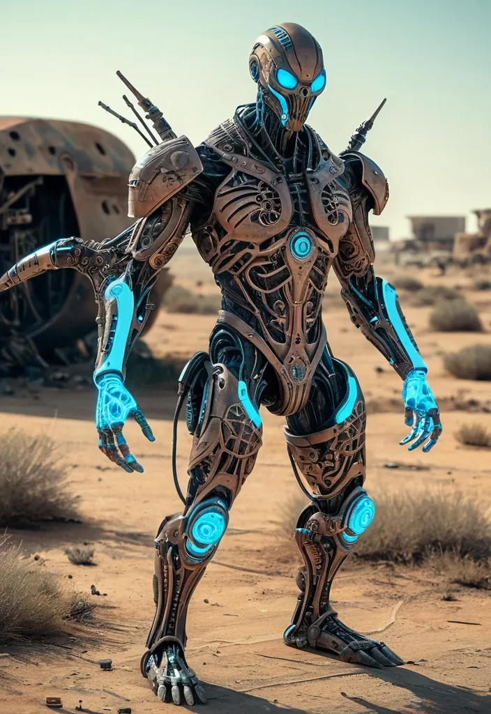 Bird eye long-distance view , Fantasy characters , techno organic , cybernetic , Electronic circuit pattern and wires , bone and metal grim dark , cybernetic muscular male Na'vi rider , a futuristic concept Drone , designed by Dr. Suess with a white shall covering the entire body and blue glow , main body is finished in smooth deep bronze with sharp copper filigree patterns that trace along the edges of moving propellers and body , at landscape of post-apocalyptic wasteland , in the style of original 1979 Mad Max. ,