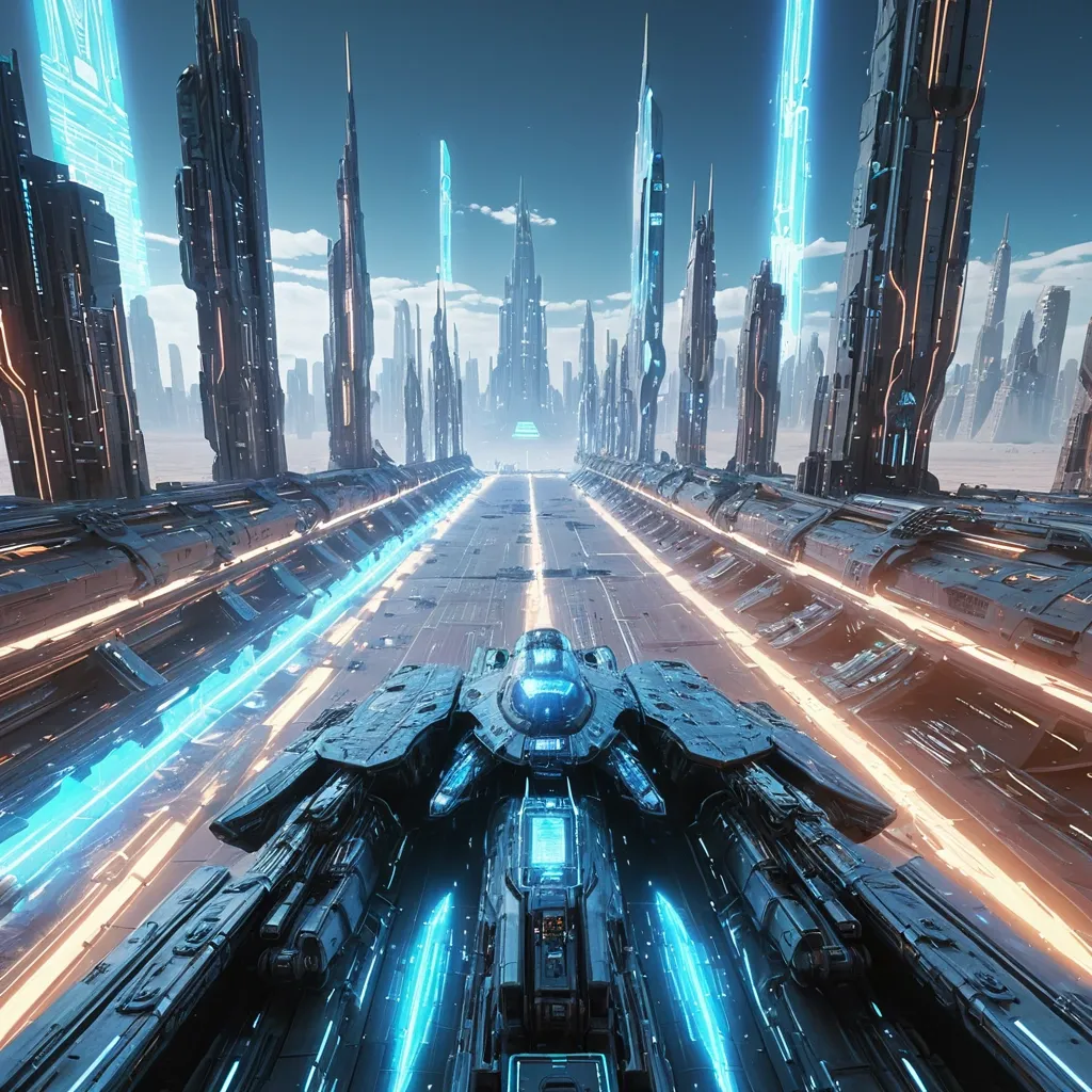 view from down to top , a Cyborg ship completely encircling , with intricate motion-sectional details revealing sprawling different types of missiles , complex infrastructure , and man interconnected in Cockpit sitting structures visible through the ship's metal exterior. The spaceship's body features bright blue glowing stripes , emphasizing its rapid motion. In the background , in the upper right corner , is a modern , desert city with tall skyscrapers and holographic Billboard interfaces hovering in the air. The atmosphere is filled with dynamism , a sense of war-zone , and speed. Soft reflections , clean 3D rendering , smooth transitions and a cyberpunk-neon-tech effect. ,