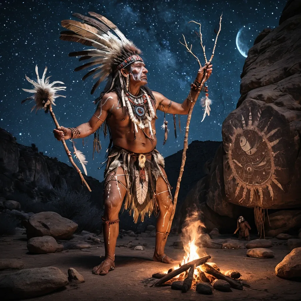 A prehistoric shaman , adorned with feathers and bone jewelry , performs a ritual dance around a crackling bonfire under a starry night sky. Cave paintings depicting ancient beasts and celestial patterns are visible on the rock face behind him. The scene is filled with a sense of spiritual mystery and communal gathering. This is a dramatic , epic concept art piece. ,