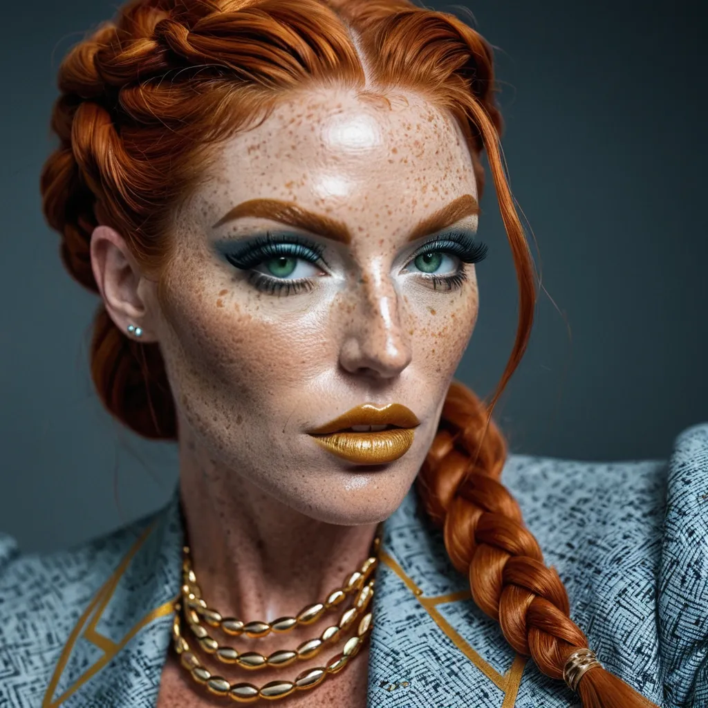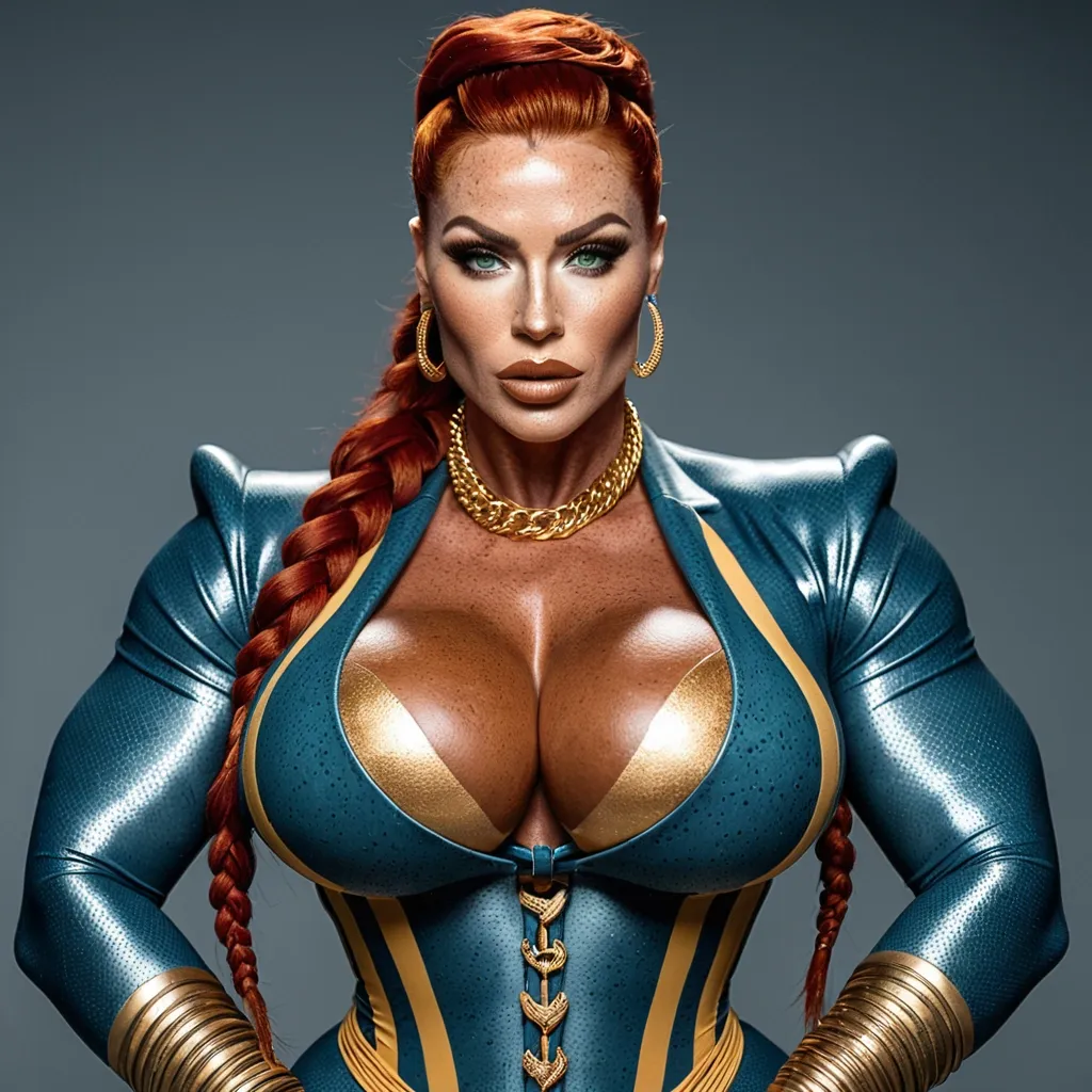 Generate Gorgeous female boss , bimbo , hourglass body , abnormally massive female bodybuilder , gorgeous , close up , full lips , big booty , redheaded , freckles on face and breast , braided design hair , feminine silhouette , too big breast , big booty , sexy thighs abs , silhouette , up close , flexing biceps , beautiful green eyes , legs are iconic and defining physical feature , both visually and in terms of combat ability.wearing an outfit that is a striking blend of elegance , power , and femininity , designed to command attention in any room. The suit is tailored to perfection , hugging the wearer’s curves with precision while emphasizing a structured silhouette. The fabric itself is a refined grey tweed patterned with subtle white grid lines , giving the suit a texture that feels both sophisticated and modern. The blazer features broad blue lapels and gold button accents , adding a luxurious touch that elevates the look beyond typical business attire. The matching high-waisted trousers elongate the frame , further enhancing the poised and commanding effect of the ensemble.The styling choices amplify the boldness of the suit. The inner blouse is a silky , greybutton-down shirt that complements the tweed’s tone while introducing a softer , feminine balance to the sharp tailoring of the jacket. The blouse peeks out neatly from under the blazer , maintaining elegance without drawing focus away from the suit’s commanding cut. Accessories are kept minimal yet intentional: a delicate layered gold necklace and hoop earrings that add glimmers of light and luxury without overpowering the outfit. The choice of voluminous , honey-brown braids cascading down her shoulders frames the face with both confidence and glamour , completing the commanding visual.Altogether , this look communicates a blend of authority and allure. It is business-ready yet fashion-forward , balancing corporate structure with vibrant femininity. The color palette blue , grey and gold avoids being overly delicate , instead embracing the richness of texture , structure , and presence. This is the kind of ensemble that speaks to ambition , sophistication , and personal style—ideal for someone who thrives in positions of influence but insists on expressing her individuality with bold elegance. It’s not just clothing—it’s a statement of power wrapped in grace. Gorgeous green eyes , amd freckles. ,