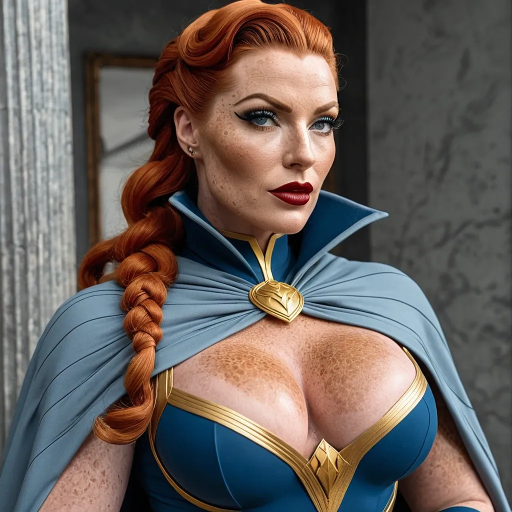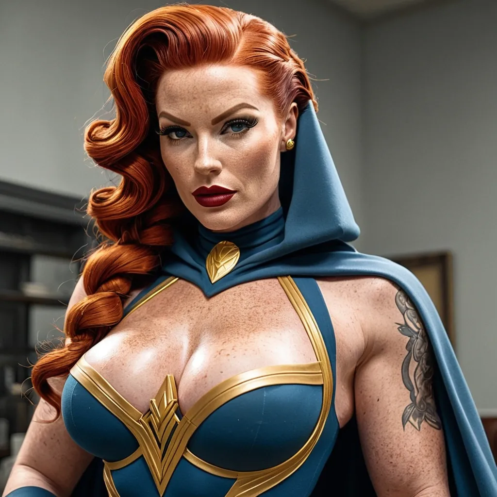 1940s era , 1940s superhero , Generate Gorgeous female boss , bimbo , hourglass body , abnormally massive female bodybuilder , gorgeous , close up , full lips , big booty , redheaded , freckles on face and breast , 1940s hair , braided design hair , feminine silhouette , too big breast , big booty , sexy thighs abs , silhouette , up close , flexing biceps , beautiful green eyes , legs are iconic and defining physical feature , both visually and in terms of combat ability.wearing an outfit that is a striking blend of elegance , power , and femininity , designed to command attention in any room. The suit is tailored to perfection , hugging the wearer’s curves with precision while emphasizing a structured silhouette. The fabric itself is a refined grey tweed patterned with subtle white grid lines , giving the suit a texture that feels both sophisticated and modern. The blazer features broad blue lapels and gold button accents , adding a luxurious touch that elevates the look beyond typical business attire. The matching high-waisted trousers elongate the frame , further enhancing the poised and commanding effect of the ensemble.The styling choices amplify the boldness of the suit. The inner blouse is a silky , greybutton-down shirt that complements the tweed’s tone while introducing a softer , feminine balance to the sharp tailoring of the jacket. The blouse peeks out neatly from under the blazer , maintaining elegance without drawing focus away from the suit’s commanding cut. Accessories are kept minimal yet intentional: a delicate layered gold necklace and hoop earrings that add glimmers of light and luxury without overpowering the outfit. The choice of voluminous , honey-brown braids cascading down her shoulders frames the face with both confidence and glamour , completing the commanding visual.Altogether , this look communicates a blend of authority and allure. It is business-ready yet fashion-forward , balancing corporate structure with vibrant femininity. The color palette blue , grey and gold avoids being overly delicate , instead embracing the richness of texture , structure , and presence. This is the kind of ensemble that speaks to ambition , sophistication , and personal style—ideal for someone who thrives in positions of influence but insists on expressing her individuality with bold elegance. It’s not just clothing—it’s a statement of power wrapped in grace. Bodysuit , Golden eagle emblem on chest , half mask , cape and hood. ,
