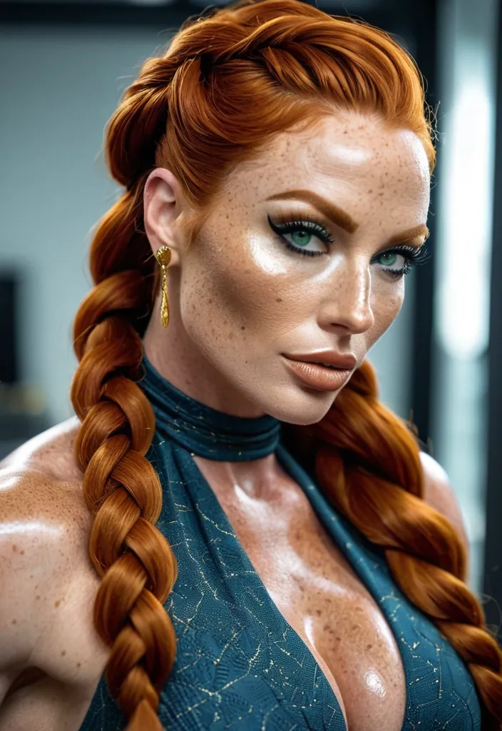 Generate Gorgeous female boss , bimbo , hourglass body , abnormally massive female bodybuilder , gorgeous , close up , full lips , big booty , redheaded , freckles on face and breast , braided design hair , feminine silhouette , too big breast , big booty , sexy thighs abs , silhouette , up close , flexing biceps , beautiful green eyes , legs are iconic and defining physical feature , both visually and in terms of combat ability.wearing an outfit that is a striking blend of elegance , power , and femininity , designed to command attention in any room. The suit is tailored to perfection , hugging the wearer’s curves with precision while emphasizing a structured silhouette. The fabric itself is a refined grey tweed patterned with subtle white grid lines , giving the suit a texture that feels both sophisticated and modern. The blazer features broad blue lapels and gold button accents , adding a luxurious touch that elevates the look beyond typical business attire. The matching high-waisted trousers elongate the frame , further enhancing the poised and commanding effect of the ensemble.The styling choices amplify the boldness of the suit. The inner blouse is a silky , greybutton-down shirt that complements the tweed’s tone while introducing a softer , feminine balance to the sharp tailoring of the jacket. The blouse peeks out neatly from under the blazer , maintaining elegance without drawing focus away from the suit’s commanding cut. Accessories are kept minimal yet intentional: a delicate layered gold necklace and hoop earrings that add glimmers of light and luxury without overpowering the outfit. The choice of voluminous , honey-brown braids cascading down her shoulders frames the face with both confidence and glamour , completing the commanding visual.Altogether , this look communicates a blend of authority and allure. It is business-ready yet fashion-forward , balancing corporate structure with vibrant femininity. The color palette blue , grey and gold avoids being overly delicate , instead embracing the richness of texture , structure , and presence. This is the kind of ensemble that speaks to ambition , sophistication , and personal style—ideal for someone who thrives in positions of influence but insists on expressing her individuality with bold elegance. It’s not just clothing—it’s a statement of power wrapped in grace. Gorgeous green eyes , and freckles. ,