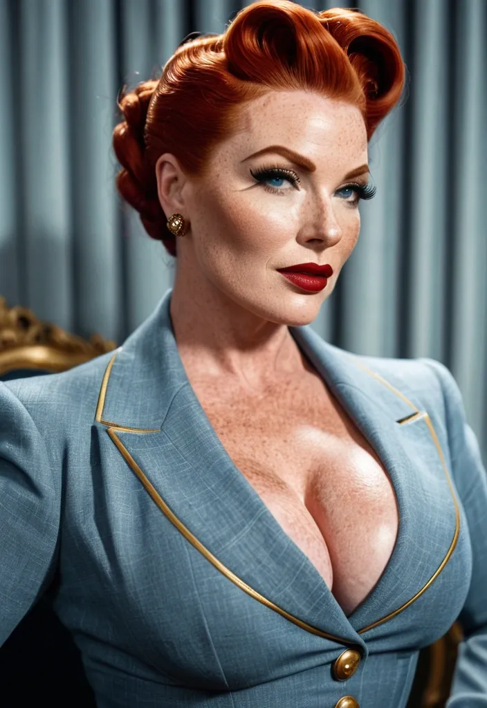 1940s era Generate Gorgeous female boss , bimbo , hourglass body , abnormally massive female bodybuilder , gorgeous , close up , full lips , big booty , redheaded , freckles on face and breast , 1940s hair , braided design hair , feminine silhouette , too big breast , big booty , sexy thighs abs , silhouette , up close , flexing biceps , beautiful green eyes , legs are iconic and defining physical feature , both visually and in terms of combat ability.wearing an outfit that is a striking blend of elegance , power , and femininity , designed to command attention in any room. The suit is tailored to perfection , hugging the wearer’s curves with precision while emphasizing a structured silhouette. The fabric itself is a refined grey tweed patterned with subtle white grid lines , giving the suit a texture that feels both sophisticated and modern. The blazer features broad blue lapels and gold button accents , adding a luxurious touch that elevates the look beyond typical business attire. The matching high-waisted trousers elongate the frame , further enhancing the poised and commanding effect of the ensemble.The styling choices amplify the boldness of the suit. The inner blouse is a silky , greybutton-down shirt that complements the tweed’s tone while introducing a softer , feminine balance to the sharp tailoring of the jacket. The blouse peeks out neatly from under the blazer , maintaining elegance without drawing focus away from the suit’s commanding cut. Accessories are kept minimal yet intentional: a delicate layered gold necklace and hoop earrings that add glimmers of light and luxury without overpowering the outfit. The choice of voluminous , honey-brown braids cascading down her shoulders frames the face with both confidence and glamour , completing the commanding visual.Altogether , this look communicates a blend of authority and allure. It is business-ready yet fashion-forward , balancing corporate structure with vibrant femininity. The color palette blue , grey and gold avoids being overly delicate , instead embracing the richness of texture , structure , and presence. This is the kind of ensemble that speaks to ambition , sophistication , and personal style—ideal for someone who thrives in positions of influence but insists on expressing her individuality with bold elegance. It’s not just clothing—it’s a statement of power wrapped in grace. ,