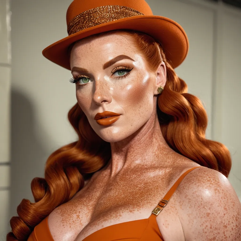 1940s era , Generate Gorgeous female boss , bimbo , hourglass body , abnormally massive female bodybuilder , gorgeous , close up , full lips , big booty , redheaded , freckles on face and breast , 1949s braided design hair , 1940s hat , feminine silhouette , too big breast , big booty , sexy thighs abs , silhouette , up close , flexing biceps , beautiful green eyes , legs are iconic and defining physical feature , both visually and in terms of combat ability.wearing an outfit that is a striking blend of elegance , power , and femininity , designed to command attention in any room. The suit is tailored to perfection , hugging the wearer’s curves with precision while emphasizing a structured silhouette. The fabric itself is a refined grey tweed patterned with subtle white grid lines , giving the suit a texture that feels both sophisticated and modern. The blazer features broad blue lapels and gold button accents , adding a luxurious touch that elevates the look beyond typical business attire. The matching high-waisted trousers elongate the frame , further enhancing the poised and commanding effect of the ensemble.The styling choices amplify the boldness of the suit. The inner blouse is a silky , greybutton-down shirt that complements the tweed’s tone while introducing a softer , feminine balance to the sharp tailoring of the jacket. The blouse peeks out neatly from under the blazer , maintaining elegance without drawing focus away from the suit’s commanding cut. Accessories are kept minimal yet intentional: a delicate layered gold necklace and hoop earrings that add glimmers of light and luxury without overpowering the outfit. The choice of voluminous , honey-brown braids cascading down her shoulders frames the face with both confidence and glamour , completing the commanding visual.Altogether , this look communicates a blend of authority and allure. It is business-ready yet fashion-forward , balancing corporate structure with vibrant femininity. The color palette orange , brown and gold avoids being overly delicate , instead embracing the richness of texture , structure , and presence. This is the kind of ensemble that speaks to ambition , sophistication , and personal style—ideal for someone who thrives in positions of influence but insists on expressing her individuality with bold elegance. It’s not just clothing—it’s a statement of power wrapped in grace. Gorgeous green eyes , and freckles. T-shirt ,
