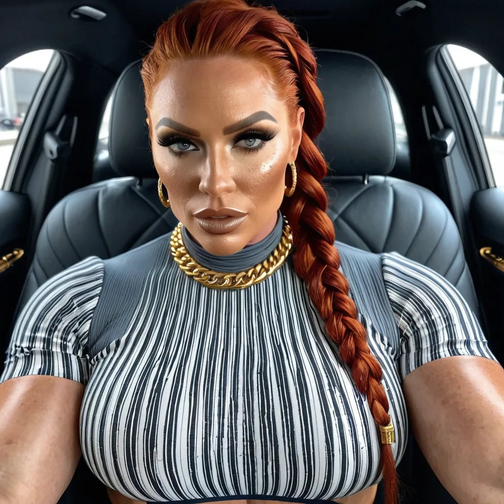 Generate Gorgeous female boss , bimbo , hourglass body , abnormally massive female bodybuilder , gorgeous , close up , full lips , big booty , redheaded , freckles on face and breast , braided design hair , feminine silhouette , too big breast , big booty , sexy thighs abs , silhouette , up close , flexing biceps , beautiful green eyes , legs are iconic and defining physical feature , both visually and in terms of combat ability.wearing an outfit that is a striking blend of elegance , power , and femininity , designed to command attention in any room. The suit is tailored to perfection , hugging the wearer’s curves with precision while emphasizing a structured silhouette. The fabric itself is a refined grey tweed patterned with subtle white grid lines , giving the suit a texture that feels both sophisticated and modern. The blazer features broad blue lapels and gold button accents , adding a luxurious touch that elevates the look beyond typical business attire. The matching high-waisted trousers elongate the frame , further enhancing the poised and commanding effect of the ensemble.The styling choices amplify the boldness of the suit. The inner blouse is a silky , greybutton-down shirt that complements the tweed’s tone while introducing a softer , feminine balance to the sharp tailoring of the jacket. The blouse peeks out neatly from under the blazer , maintaining elegance without drawing focus away from the suit’s commanding cut. Accessories are kept minimal yet intentional: a delicate layered gold necklace and hoop earrings that add glimmers of light and luxury without overpowering the outfit. The choice of voluminous , honey-brown braids cascading down her shoulders frames the face with both confidence and glamour , completing the commanding visual.Altogether , this look communicates a blend of authority and allure. It is business-ready yet fashion-forward , balancing corporate structure with vibrant femininity. The color palette blue , grey and gold avoids being overly delicate , instead embracing the richness of texture , structure , and presence. This is the kind of ensemble that speaks to ambition , sophistication , and personal style—ideal for someone who thrives in positions of influence but insists on expressing her individuality with bold elegance. It’s not just clothing—it’s a statement of power wrapped in grace.sitting in backseat of luxurious car , black and white striped t-shirt , gold necklace , enormous breast , enormous butt ,