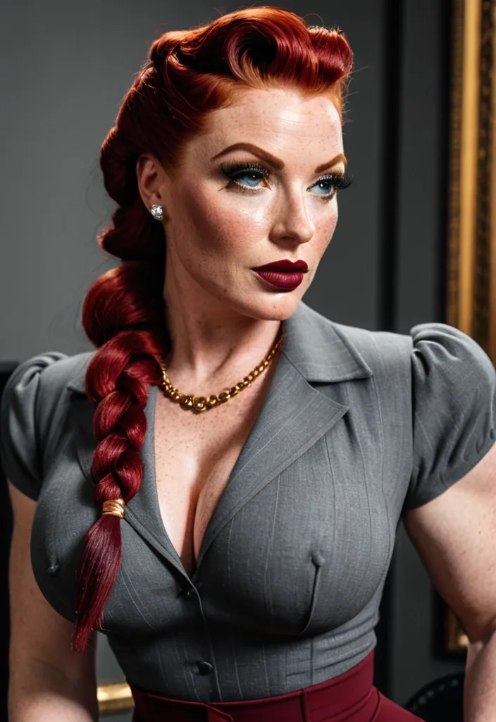 1940s era 24 years old , Generate Gorgeous female boss , bimbo , hourglass body , abnormally massive female bodybuilder , gorgeous , close up , full lips , big booty , redheaded , freckles on face and breast , 1940s hair , braided design hair , feminine silhouette , too big breast , big booty , sexy thighs abs , silhouette , up close , flexing biceps , beautiful green eyes , legs are iconic and defining physical feature , both visually and in terms of combat ability.wearing an outfit that is a striking blend of elegance , power , and femininity , designed to command attention in any room. The suit is tailored to perfection , hugging the wearer’s curves with precision while emphasizing a structured silhouette. The fabric itself is a refined grey tweed patterned with subtle white grid lines , giving the suit a texture that feels both sophisticated and modern. The blazer features broad blue lapels and gold button accents , adding a luxurious touch that elevates the look beyond typical business attire. The matching high-waisted trousers elongate the frame , further enhancing the poised and commanding effect of the ensemble.The styling choices amplify the boldness of the suit. The inner blouse is a silky , greybutton-down shirt that complements the tweed’s tone while introducing a softer , feminine balance to the sharp tailoring of the jacket. The blouse peeks out neatly from under the blazer , maintaining elegance without drawing focus away from the suit’s commanding cut. Accessories are kept minimal yet intentional: a delicate layered gold necklace and hoop earrings that add glimmers of light and luxury without overpowering the outfit. The choice of voluminous , honey-brown braids cascading down her shoulders frames the face with both confidence and glamour , completing the commanding visual.Altogether , this look communicates a blend of authority and allure. It is business-ready yet fashion-forward , balancing corporate structure with vibrant femininity. The color palette burgundy , black , gray and gold avoids being overly delicate , instead embracing the richness of texture , structure , and presence. This is the kind of ensemble that speaks to ambition , sophistication , and personal style—ideal for someone who thrives in positions of influence but insists on expressing her individuality with bold elegance. It’s not just clothing—it’s a statement of power wrapped in grace. T-shirt and skirt ,