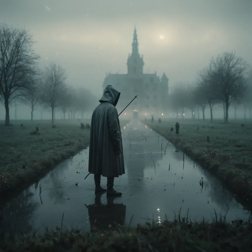 Hyperreal conceptual , Hieronymus Bosch , paintings style , intriguing , cinematic lighting , misty atmosphere , rule of thirds composition , wide angle lens , expansive view , shallow depth of field , bokeh background , dramatic , intense , powerful , mysterious , enigmatic , foggy , landscape 16:9 ,