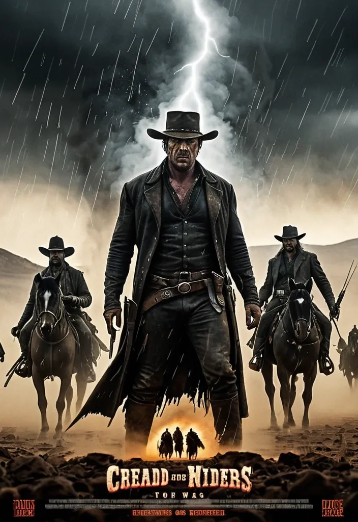 Western style movie poster: At the center is a front half face of a anger Cowgirl look , of Carnage with a photo-realistic face resembling an actual Brendan Fraser. Starting from her detailed eyes , few Bullets in air , slow motion effect , over go the head , the rest of his head transitions into a tornado that both shapes and fills the structure of the head. This tornado , (haze , black fog , mist:1.3) , densely packed with composed entirely from soft smoke and mist , has a semi-transparent quality akin to fog. The Old West , dust , desert is a significant location in the movie , serving as a backdrop for the battles and chases , but the villain does not specifically meet the heroes within a tornado , while group of Native cowboys with gunslinger horse-riders running tall in the distance against a vivid night sky. a sticker at right top side cowboys with different weapons and poses logo ,