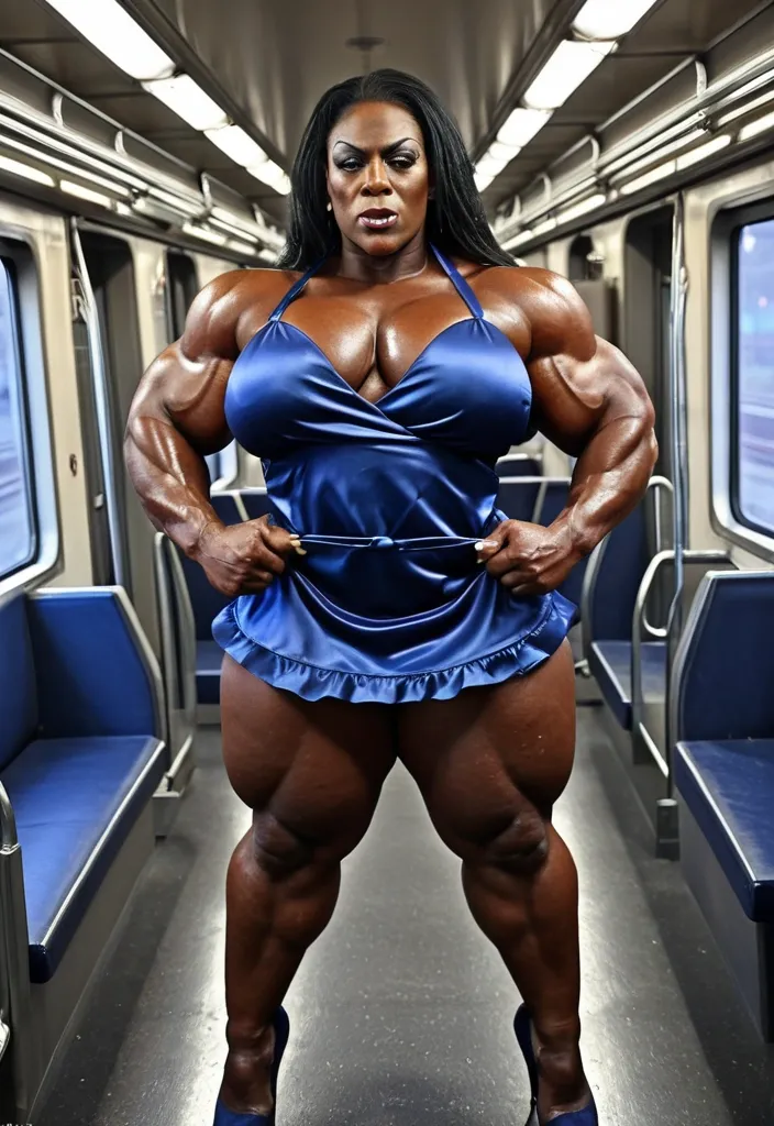À african giant muscular chubby femalebodybuilder , housewife black woman BBW musclée , heavy weight bodybuildeuse géante et plantureuse with giant chest , imposante dame massive , beautiful make up face , in a train , avec de gros seins , énormes biceps musclés , in blue marine satin short mini nightgown with heels , exposant les seins , bras musclés exposés , dominante , jambes massives exposées , agressive , ,