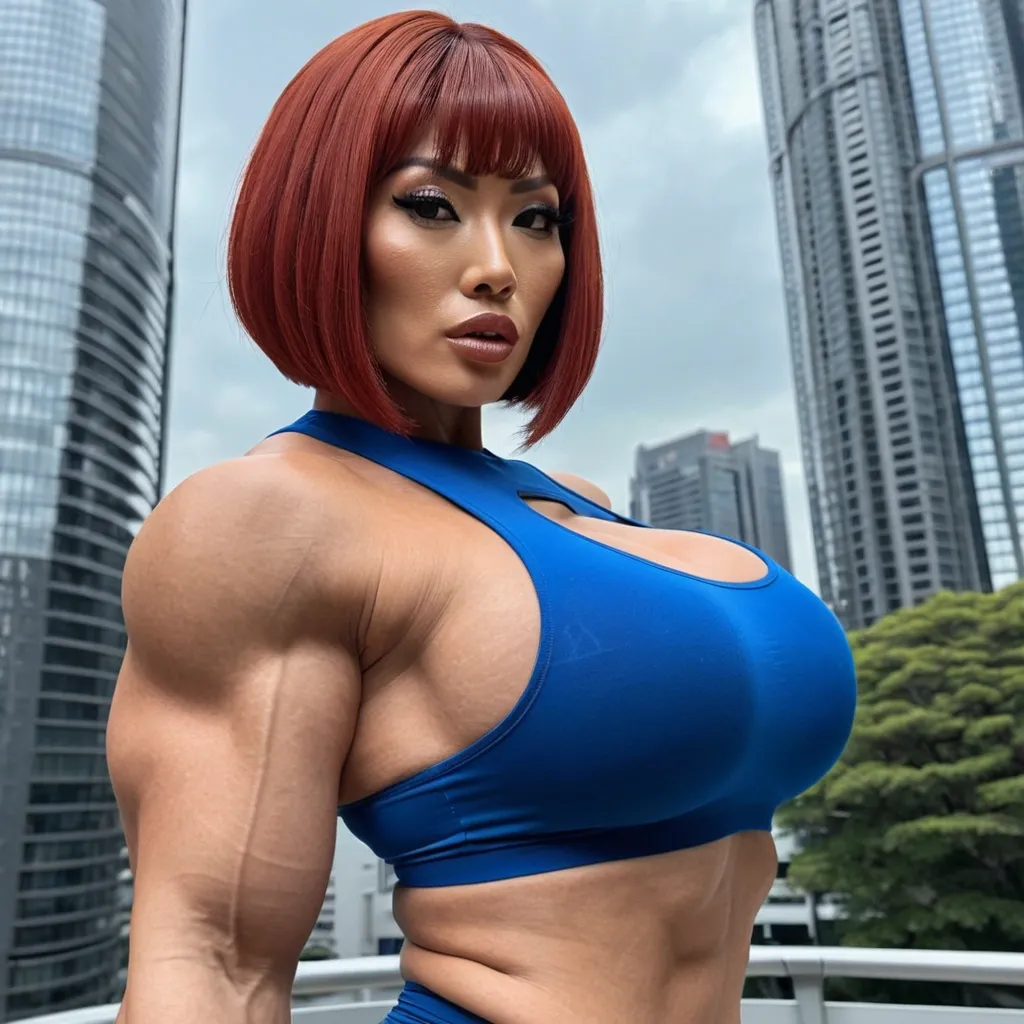 Generate Gorgeous female boss , bimbo , hourglass body , Japanese woman , abnormally massive female bodybuilder , gorgeous , close up , full lips , big booty , red hair , short bob-cut hair , , feminine silhouette , too big breast , big booty , sexy thighs abs , silhouette , up close , flexing biceps , beautiful brown eyes , legs are iconic and defining physical feature , both visually and in terms of combat ability.wearing an outfit that is a striking blend of elegance , power , and femininity , designed to command attention in any room. The suit is tailored to perfection , hugging the wearer’s curves with precision while emphasizing a structured silhouette. The fabric itself is a refined grey tweed patterned with subtle white grid lines , giving the suit a texture that feels both sophisticated and modern. The blazer features broad blue lapels and gold button accents , adding a luxurious touch that elevates the look beyond typical business attire. The matching high-waisted trousers elongate the frame , further enhancing the poised and commanding effect of the ensemble.The styling choices amplify the boldness of the suit. The inner blouse is a silky , greybutton-down shirt that complements the tweed’s tone while introducing a softer , feminine balance to the sharp tailoring of the jacket. The blouse peeks out neatly from under the blazer , maintaining elegance without drawing focus away from the suit’s commanding cut. Accessories are kept minimal yet intentional: a delicate layered gold necklace and hoop earrings that add glimmers of light and luxury without overpowering the outfit. The choice of voluminous , honey-brown braids cascading down her shoulders frames the face with both confidence and glamour , completing the commanding visual.Altogether , this look communicates a blend of authority and allure. It is business-ready yet fashion-forward , balancing corporate structure with vibrant femininity. The color palette blue , grey and gold avoids being overly delicate , instead embracing the richness of texture , structure , and presence. This is the kind of ensemble that speaks to ambition , sophistication , and personal style—ideal for someone who thrives in positions of influence but insists on expressing her individuality with bold elegance. It’s not just clothing—it’s a statement of power wrapped in grace. In luxury living legs that could crush a watermelon , skirt high boots are a bold and striking statement piece , crafted in glossy black patent leather that gives them a sleek , polished finish. Rising to just below the knee , the boots feature three adjustable buckle straps along the shaft , adding both edge and detail to their design. The towering stiletto heel , paired with a thick platform sole , creates an ultra-dramatic silhouette that elongates the leg and exudes power and confidence. With their combination of shine , height , and structure , these boots perfectly balance fierce femininity with high-fashion allure. High cheekbones , prominent jawline , gorgeous big brown eyes , enormous breast , blue tank top , high rise grey short , enormous butt ,