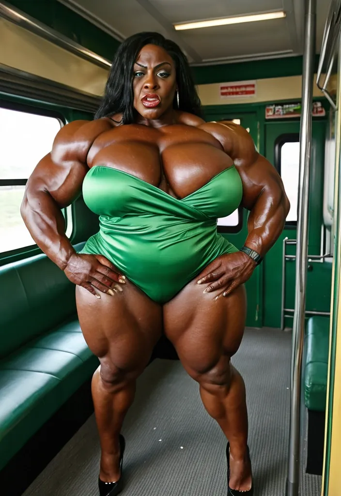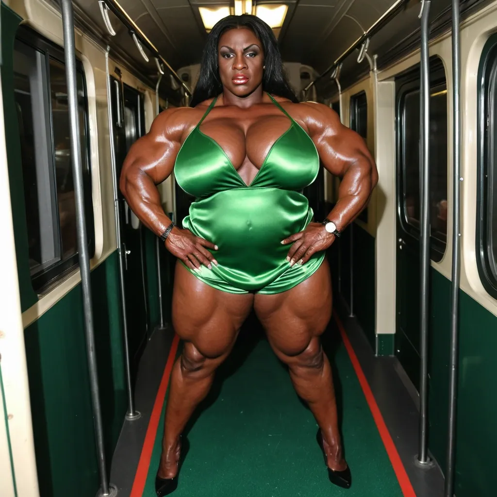 À african giant muscular chubby femalebodybuilder , housewife black woman BBW musclée , heavy weight bodybuildeuse géante et plantureuse with giant chest , imposante dame massive , beautiful make up face , in a train , avec de gros seins , énormes biceps musclés , in green satin short mini loose strapless sundress with heels , exposant les seins , bras musclés exposés , dominante , jambes massives exposées , agressive , ,