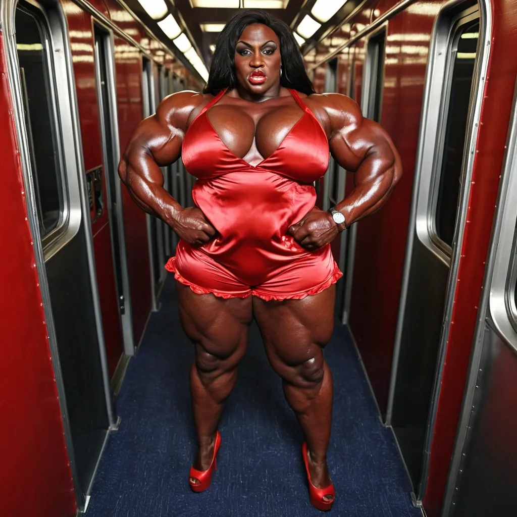 À african giant muscular chubby femalebodybuilder , housewife black woman BBW musclée , heavy weight bodybuildeuse géante et plantureuse with giant chest , imposante dame massive , beautiful make up face , in a train , avec de gros seins , énormes biceps musclés , in red satin short mini nightgown with heels , exposant les seins , bras musclés exposés , dominante , jambes massives exposées , agressive , ,