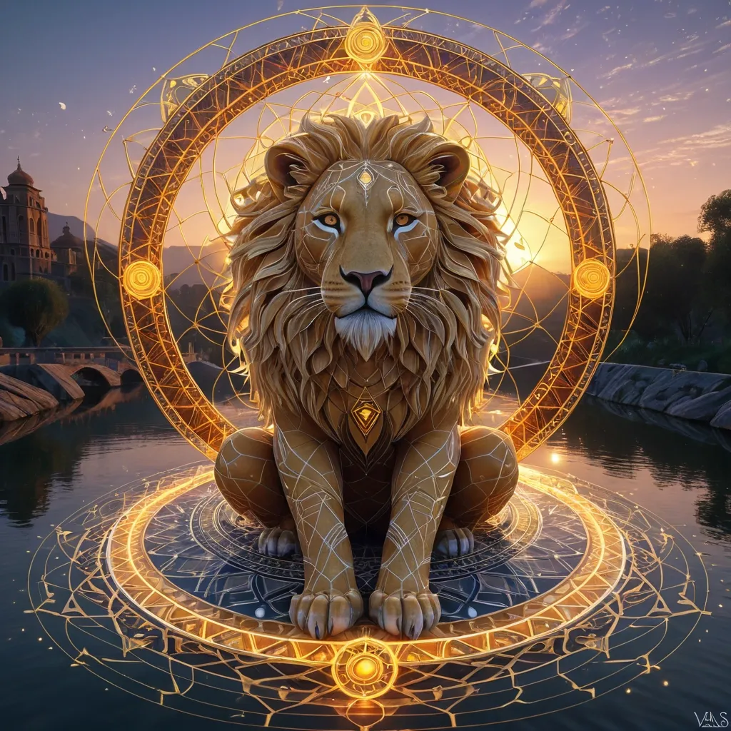 Epic Masterpiece: A majestic and serene lioness (Eva's Leo sun) and a balanced , architectural scales (Simon's Libra sun) intertwined as a single sacred geometry mandala , floating above the Dreisam river at dusk. Their energies form a bridge. The style is epic digital painting , hyperdetailed , by artists like Android Jones and Asja Boros , rich symbolism , mystical atmosphere , octane render , 8k , high quality ,