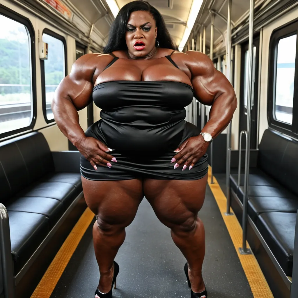 À african giant muscular chubby femalebodybuilder , housewife black woman BBW musclée , heavy weight bodybuildeuse géante et plantureuse with giant chest , imposante dame massive , beautiful make up face , in a train , avec de gros seins , énormes biceps musclés , in black satin short mini loose strapless sundress with heels , exposant les seins , bras musclés exposés , dominante , jambes massives exposées , agressive , ,