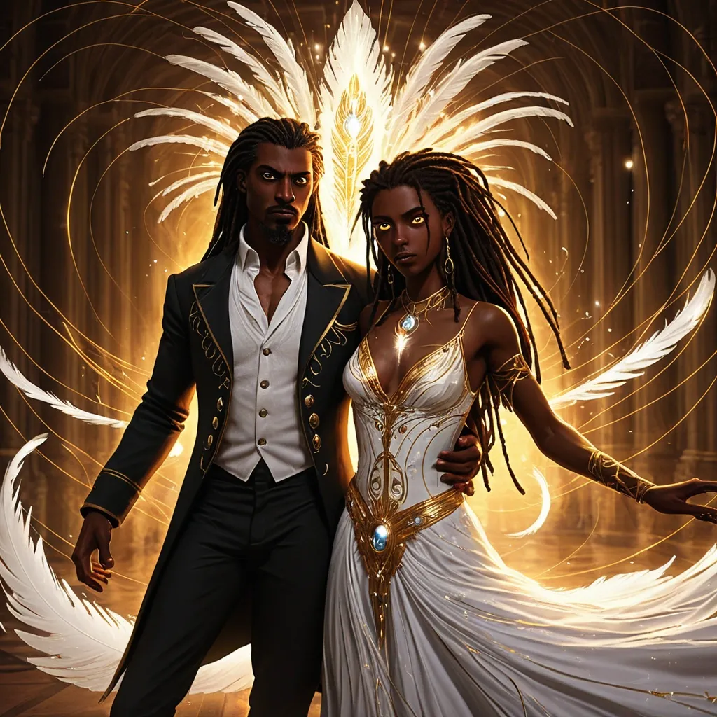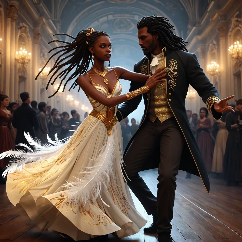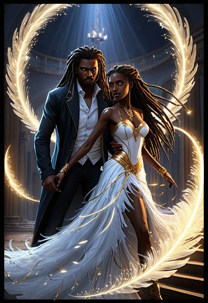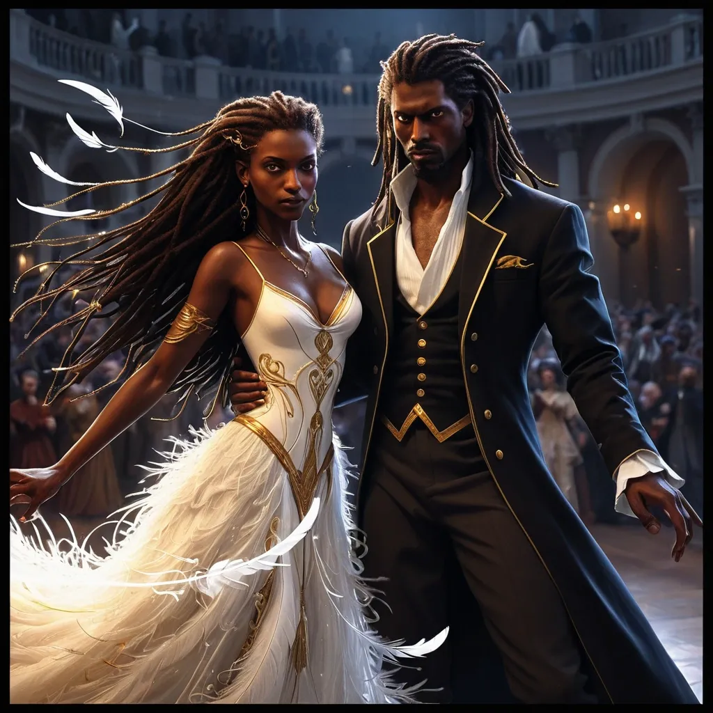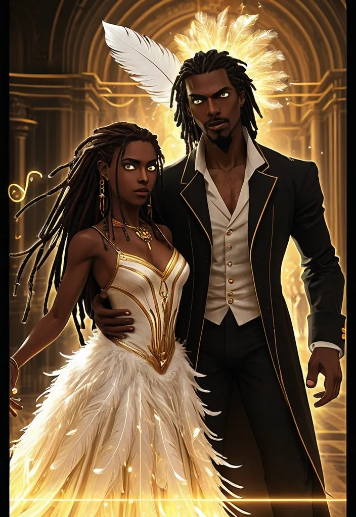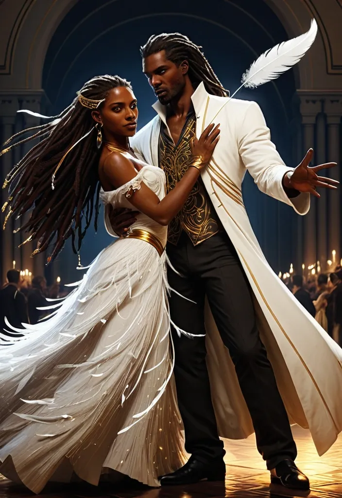 https://arthub.ai/post/ff4afd23-635e-42d2-81da-01c7865701ed Style: Illustrations combining comic books , graphic novels , and sequential art. Utilize vibrant and dynamic colors , with attention to framing and composition to create a sense of movement and action. Incorporate graphic design elements , such as stylized speech bubbles (optional) and subtle visual onomatopoeia to enhance the impact of the scene. Maintain a sense of realism and depth , with attention to detail and character anatomy. The lighting should be dramatic and expressive , creating an immersive and emotional atmosphere. , Aidan: Strong , elegant , imposing werewolf alpha , 25-35 years old (each era) , dark skin , dreads , lupine eyes. Powerful , determined. , Slender , graceful vampire , 25-35 years old (each era) , dark skin , long dark dreads , captivating eyes. Mysterious , beautiful. , 1: First Encounter (1905): Vienna ball , "spark" first glance. Liaandra (stunning dress) , Aidan (imposing). Vibrant colors , focus on characters , blurred background. Details: Ballroom , dresses , eye contact , bokeh. Colors: Reds , golds , whites , sapphire. ,
