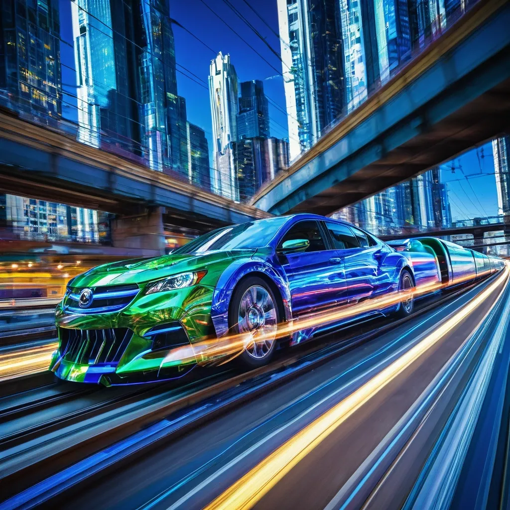 A Light Trail Chromatic Aberration of Hulk , where the light trails split into their component colors , creating a vibrant and distorted effect , embodying the dynamism of the machine age. Metallic hues of chrome and cobalt blue dominate , dashing at incredible speed across a train track suspended between two towering buildings depicted with motion blur emphasizing the subject's incredible velocity and forward momentum ,