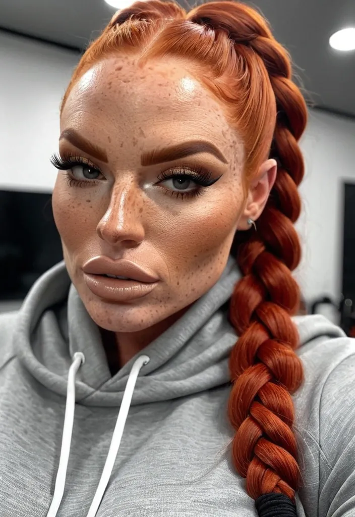 Generate Gorgeous female boss , bimbo , hourglass body , abnormally massive female bodybuilder , gorgeous , close up , full lips , big booty , redheaded , freckles on face and breast , braided design hair , feminine silhouette , too big breast , big booty , sexy thighs abs , silhouette , up close , flexing biceps , beautiful green eyes , legs are iconic and defining physical feature , both visually and in terms of combat ability.wearing an outfit that is a striking blend of elegance , power , and femininity , designed to command attention in any room. The suit is tailored to perfection , hugging the wearer’s curves with precision while emphasizing a structured silhouette. The fabric itself is a refined grey tweed patterned with subtle white grid lines , giving the suit a texture that feels both sophisticated and modern. The blazer features broad blue lapels and gold button accents , adding a luxurious touch that elevates the look beyond typical business attire. The matching high-waisted trousers elongate the frame , further enhancing the poised and commanding effect of the ensemble.The styling choices amplify the boldness of the suit. The inner blouse is a silky , greybutton-down shirt that complements the tweed’s tone while introducing a softer , feminine balance to the sharp tailoring of the jacket. The blouse peeks out neatly from under the blazer , maintaining elegance without drawing focus away from the suit’s commanding cut. Accessories are kept minimal yet intentional: a delicate layered gold necklace and hoop earrings that add glimmers of light and luxury without overpowering the outfit. The choice of voluminous , honey-brown braids cascading down her shoulders frames the face with both confidence and glamour , completing the commanding visual.Altogether , this look communicates a blend of authority and allure. It is business-ready yet fashion-forward , balancing corporate structure with vibrant femininity. The color palette blue , grey and gold avoids being overly delicate , instead embracing the richness of texture , structure , and presence. This is the kind of ensemble that speaks to ambition , sophistication , and personal style—ideal for someone who thrives in positions of influence but insists on expressing her individuality with bold elegance. It’s not just clothing—it’s a statement of power wrapped in grace. In luxury living legs that could crush a watermelon , skirt high boots are a bold and striking statement piece , crafted in glossy black patent leather that gives them a sleek , polished finish. Rising to just below the knee , the boots feature three adjustable buckle straps along the shaft , adding both edge and detail to their design. The towering stiletto heel , paired with a thick platform sole , creates an ultra-dramatic silhouette that elongates the leg and exudes power and confidence. With their combination of shine , height , and structure , these boots perfectly balance fierce femininity with high-fashion allure. Grey hoodie ,