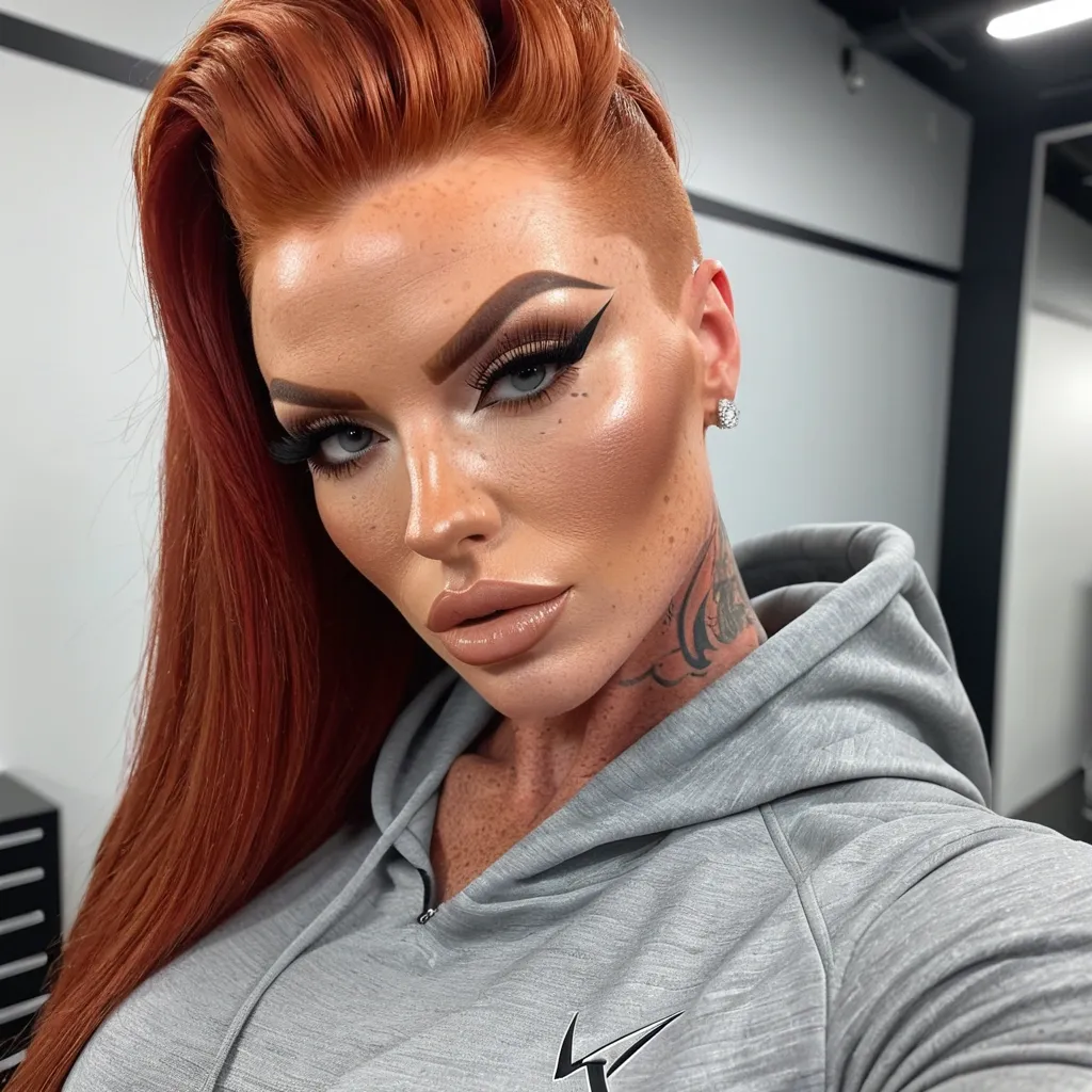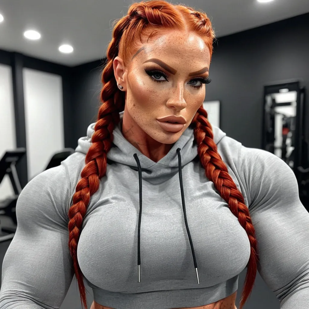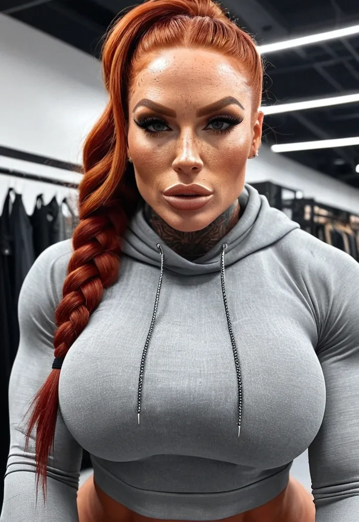 Generate Gorgeous female boss , bimbo , hourglass body , abnormally massive female bodybuilder , gorgeous , close up , full lips , big booty , redheaded , freckles on face and breast , pompadour design hair , feminine silhouette , too big breast , big booty , sexy thighs abs , silhouette , up close , flexing biceps , beautiful green eyes , legs are iconic and defining physical feature , both visually and in terms of combat ability.wearing an outfit that is a striking blend of elegance , power , and femininity , designed to command attention in any room. The suit is tailored to perfection , hugging the wearer’s curves with precision while emphasizing a structured silhouette. The fabric itself is a refined grey tweed patterned with subtle white grid lines , giving the suit a texture that feels both sophisticated and modern. The blazer features broad blue lapels and gold button accents , adding a luxurious touch that elevates the look beyond typical business attire. The matching high-waisted trousers elongate the frame , further enhancing the poised and commanding effect of the ensemble.The styling choices amplify the boldness of the suit. The inner blouse is a silky , greybutton-down shirt that complements the tweed’s tone while introducing a softer , feminine balance to the sharp tailoring of the jacket. The blouse peeks out neatly from under the blazer , maintaining elegance without drawing focus away from the suit’s commanding cut. Accessories are kept minimal yet intentional: a delicate layered gold necklace and hoop earrings that add glimmers of light and luxury without overpowering the outfit. The choice of voluminous , honey-brown braids cascading down her shoulders frames the face with both confidence and glamour , completing the commanding visual.Altogether , this look communicates a blend of authority and allure. It is business-ready yet fashion-forward , balancing corporate structure with vibrant femininity. The color palette blue , grey and gold avoids being overly delicate , instead embracing the richness of texture , structure , and presence. This is the kind of ensemble that speaks to ambition , sophistication , and personal style—ideal for someone who thrives in positions of influence but insists on expressing her individuality with bold elegance. It’s not just clothing—it’s a statement of power wrapped in grace. In luxury living legs that could crush a watermelon , skirt high boots are a bold and striking statement piece , crafted in glossy black patent leather that gives them a sleek , polished finish. Rising to just below the knee , the boots feature three adjustable buckle straps along the shaft , adding both edge and detail to their design. The towering stiletto heel , paired with a thick platform sole , creates an ultra-dramatic silhouette that elongates the leg and exudes power and confidence. With their combination of shine , height , and structure , these boots perfectly balance fierce femininity with high-fashion allure. Grey hoodie , pompadour styled hair ,