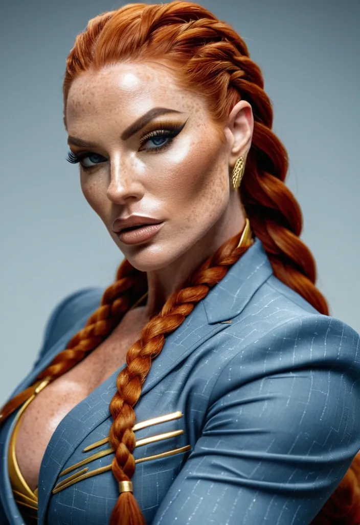 Generate Gorgeous female boss , bimbo , hourglass body , abnormally massive female bodybuilder , gorgeous , close up , full lips , big booty , redheaded , freckles on face and breast , braided design hair , feminine silhouette , too big breast , big booty , sexy thighs abs , silhouette , up close , flexing biceps , beautiful green eyes , legs are iconic and defining physical feature , both visually and in terms of combat ability.wearing an outfit that is a striking blend of elegance , power , and femininity , designed to command attention in any room. The suit is tailored to perfection , hugging the wearer’s curves with precision while emphasizing a structured silhouette. The fabric itself is a refined grey tweed patterned with subtle white grid lines , giving the suit a texture that feels both sophisticated and modern. The blazer features broad blue lapels and gold button accents , adding a luxurious touch that elevates the look beyond typical business attire. The matching high-waisted trousers elongate the frame , further enhancing the poised and commanding effect of the ensemble.The styling choices amplify the boldness of the suit. The inner blouse is a silky , greybutton-down shirt that complements the tweed’s tone while introducing a softer , feminine balance to the sharp tailoring of the jacket. The blouse peeks out neatly from under the blazer , maintaining elegance without drawing focus away from the suit’s commanding cut. Accessories are kept minimal yet intentional: a delicate layered gold necklace and hoop earrings that add glimmers of light and luxury without overpowering the outfit. The choice of voluminous , honey-brown braids cascading down her shoulders frames the face with both confidence and glamour , completing the commanding visual.Altogether , this look communicates a blend of authority and allure. It is business-ready yet fashion-forward , balancing corporate structure with vibrant femininity. The color palette blue , grey and gold avoids being overly delicate , instead embracing the richness of texture , structure , and presence. This is the kind of ensemble that speaks to ambition , sophistication , and personal style—ideal for someone who thrives in positions of influence but insists on expressing her individuality with bold elegance. It’s not just clothing—it’s a statement of power wrapped in grace. ,