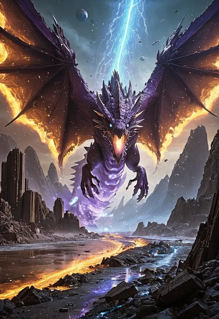 Bird's eye view , a massive purple-scaled dragon dominates the sky above a burning town. Its wings stretch wide , torn and weathered , scattering fragments of debris as it descends. The dragon’s head leans forward with an intense , predatory focus; its eyes glow with a hot yellow hue while flames burst upward beneath it. A spatial battle with interstellar starships caught in an elements storm , with debris vortex and dust trails , Below a floating bridges of glowing crystal spanning across alien mountains , with surreal atmosphere , post apocalyptic , rocky ocean shore , post apocalyptic , rocky ocean shore , sci-fi style , space opera style , fantasy style. Warm Brown , Toffee Caramel , Frosted Blue and Pale Mist. ,