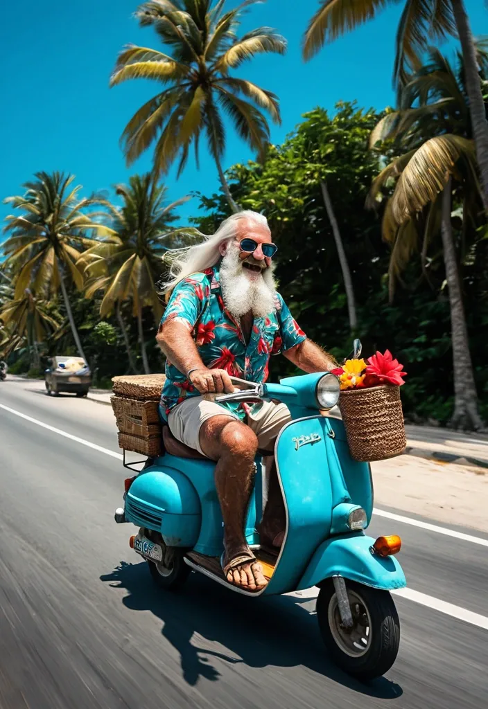 An elderly man with long white hair and a full beard rides joyfully down a tropical coastal road on an old , rusty scooter marked with the word “Vespa.” His hair and beard blow freely in the wind , along with the colorful fabric of his Hawaiian shirt decorated with bright hibiscus flowers. He wears dark sunglasses , denim shorts , and flip-flops. A small trail of smoke drifts from the exhaust , and motion blur on the tires and background adds a strong sense of speed and movement. By Giuseppe. Strapped to the rear luggage rack of the Vespa is a cheerful stack of beach essentials: a woven basket filled with drinks and fruit , a folded beach umbrella , towels , and possibly sunscreen – all bouncing slightly with the motion. The road winds along tall palm trees and the turquoise sea , under a radiant blue sky. The scene feels vibrant , dynamic , and full of summery freedom and joy – a perfect snapshot of a carefree beach adventure. ,