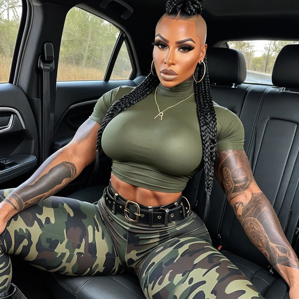 Generate Gorgeous 24 years old , female boss , dark-skinned African-American woman , pointy face , bimbo , hourglass body , abnormally massive female bodybuilder , gorgeous , close up , full lips , big booty , braided-styled-mohawk-bald-on the side , feminine silhouette , too big breast , big booty , sexy thighs abs , silhouette , up close , flexing biceps , big gorgeous honey-hazel eyes , legs are iconic and defining physical feature , both visually and in terms of combat ability.wearing an outfit that is a striking blend of elegance , power , and femininity , designed to command attention in any room. The suit is tailored to perfection , hugging the wearer’s curves with precision while emphasizing a structured silhouette. The fabric itself is a refined grey tweed patterned with subtle white grid lines , giving the suit a texture that feels both sophisticated and modern. The blazer features broad blue lapels and gold button accents , adding a luxurious touch that elevates the look beyond typical business attire. The matching high-waisted trousers elongate the frame , further enhancing the poised and commanding effect of the ensemble.The styling choices amplify the boldness of the suit. The inner blouse is a silky , greybutton-down shirt that complements the tweed’s tone while introducing a softer , feminine balance to the sharp tailoring of the jacket. The blouse peeks out neatly from under the blazer , maintaining elegance without drawing focus away from the suit’s commanding cut. Accessories are kept minimal yet intentional: a delicate layered gold necklace and hoop earrings that add glimmers of light and luxury without overpowering the outfit. The choice of voluminous , honey-brown braids cascading down her shoulders frames the face with both confidence and glamour , completing the commanding visual.Altogether , this look communicates a blend of authority and allure. It is business-ready yet fashion-forward , balancing corporate structure with vibrant femininity. The color palette blue , grey and gold avoids being overly delicate , instead embracing the richness of texture , structure , and presence. This is the kind of ensemble that speaks to ambition , sophistication , and personal style—ideal for someone who thrives in positions of influence but insists on expressing her individuality with bold elegance. It’s not just clothing—it’s a statement of power wrapped in grace. In luxury living legs that could crush a watermelon , skirt high boots are a bold and striking statement piece , crafted in glossy black patent leather that gives them a sleek , polished finish. Rising to just below the knee , the boots feature three adjustable buckle straps along the shaft , adding both edge and detail to their design. The towering stiletto heel , paired with a thick platform sole , creates an ultra-dramatic silhouette that elongates the leg and exudes power and confidence. With their combination of shine , height , and structure , these boots perfectly balance fierce femininity with high-fashion allure. High cheekbones , prominent jawline , big gorgeous honey-hazel eyes , enormous breast , black T-shirt. Green , brown snd black camouflage pants , black combat boots , enormous breast , enormous butt , small waist , abs , thong , sitting down in backseat of jeep with tinted windows ,