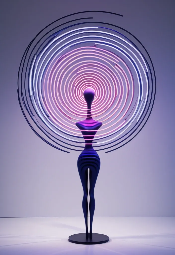 A giant spiral sculpture composed of interwoven light streams and spiral forms floats in a void , casting soft , diffused shadows. The color palette is a gradient of deep indigo to electric magenta. The head tilts gently upward , defined only by subtle curves and shadows formed by the color transitions. Black desert and in front a Stick Figure Child: The child's image is very simple , drawn only with black lines. Standing in the center of the image , the child is thin , with empty and bewildered eyes , and in front of. ,
