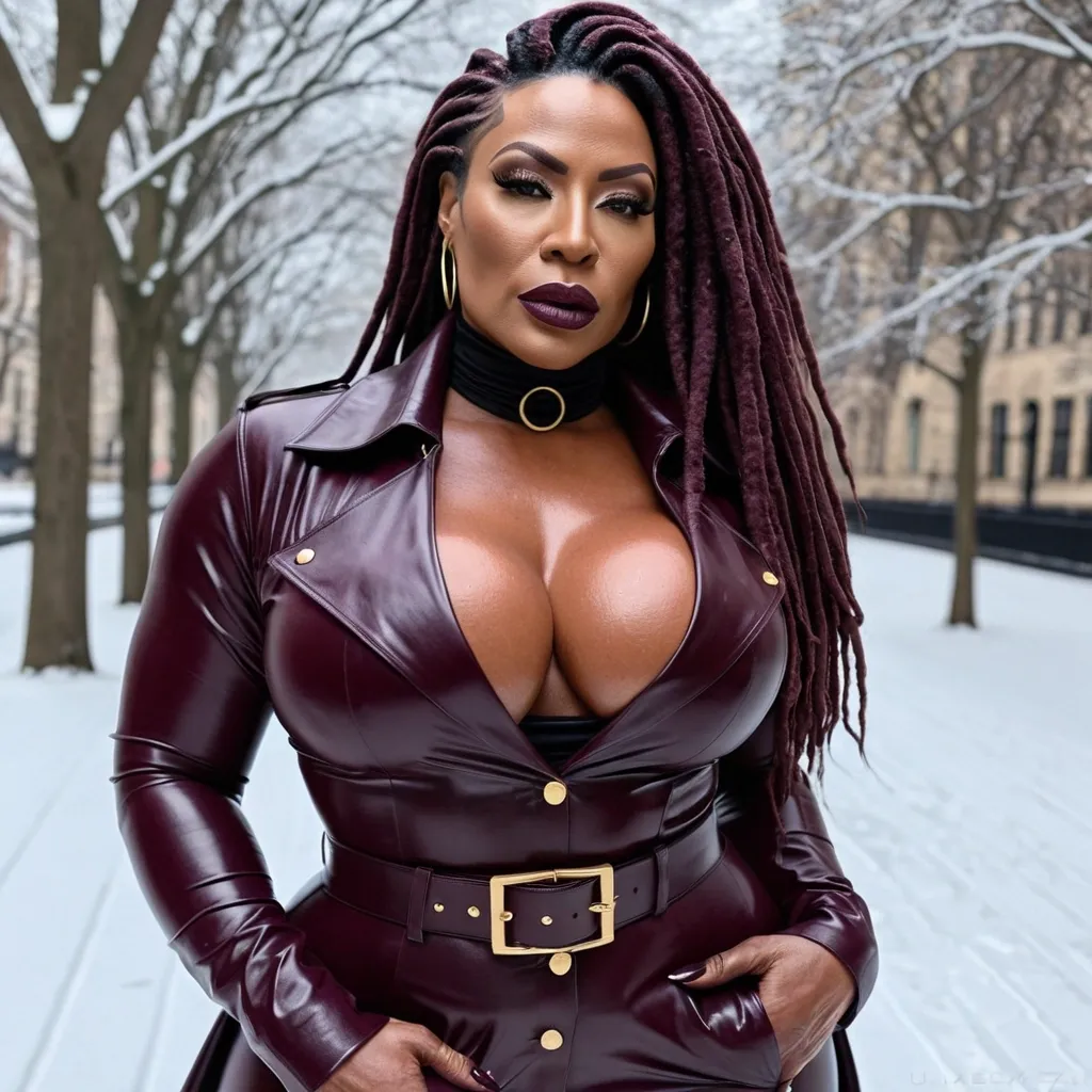 Generate Gorgeous 42 years old , female boss , dark-skinned African-American woman , bimbo , hourglass body , abnormally massive female bodybuilder , gorgeous , close up , full lips , big booty , brown , dreadlocks , feminine silhouette , too big breast , big booty , sexy thighs abs , silhouette , up close , flexing biceps , gorgeous brown eyes , legs are iconic and defining physical feature , both visually and in terms of combat ability.wearing an outfit that is a striking blend of elegance , power , and femininity , designed to command attention in any room. The suit is tailored to perfection , hugging the wearer’s curves with precision while emphasizing a structured silhouette. The fabric itself is a refined grey tweed patterned with subtle white grid lines , giving the suit a texture that feels both sophisticated and modern. The blazer features broad blue lapels and gold button accents , adding a luxurious touch that elevates the look beyond typical business attire. The matching high-waisted trousers elongate the frame , further enhancing the poised and commanding effect of the ensemble.The styling choices amplify the boldness of the suit. The inner blouse is a silky , greybutton-down shirt that complements the tweed’s tone while introducing a softer , feminine balance to the sharp tailoring of the jacket. The blouse peeks out neatly from under the blazer , maintaining elegance without drawing focus away from the suit’s commanding cut. Accessories are kept minimal yet intentional: a delicate layered gold necklace and hoop earrings that add glimmers of light and luxury without overpowering the outfit. The choice of voluminous , honey-brown braids cascading down her shoulders frames the face with both confidence and glamour , completing the commanding visual.Altogether , this look communicates a blend of authority and allure. It is business-ready yet fashion-forward , balancing corporate structure with vibrant femininity. The color palette blue , grey and gold avoids being overly delicate , instead embracing the richness of texture , structure , and presence. This is the kind of ensemble that speaks to ambition , sophistication , and personal style—ideal for someone who thrives in positions of influence but insists on expressing her individuality with bold elegance. It’s not just clothing—it’s a statement of power wrapped in grace. In luxury living legs that could crush a watermelon , skirt high boots are a bold and striking statement piece , crafted in glossy black patent leather that gives them a sleek , polished finish. Rising to just below the knee , the boots feature three adjustable buckle straps along the shaft , adding both edge and detail to their design. The towering stiletto heel , paired with a thick platform sole , creates an ultra-dramatic silhouette that elongates the leg and exudes power and confidence. With their combination of shine , height , and structure , these boots perfectly balance fierce femininity with high-fashion allure. High cheekbones , prominent jawline , gorgeous big brown eyes , , enormous breast , She is wearing a long , form-fitting dark burgundy leather trench coat that is a button up velvet violet collard shirt paired with gloves violet leather , a gold belt , and grey pants , outside in the snow in a beautiful park gorgeous brown eyes , closed collar black turtleneck oxford t-shirt , , modest closed torso t-shirt. White t- shirt ,