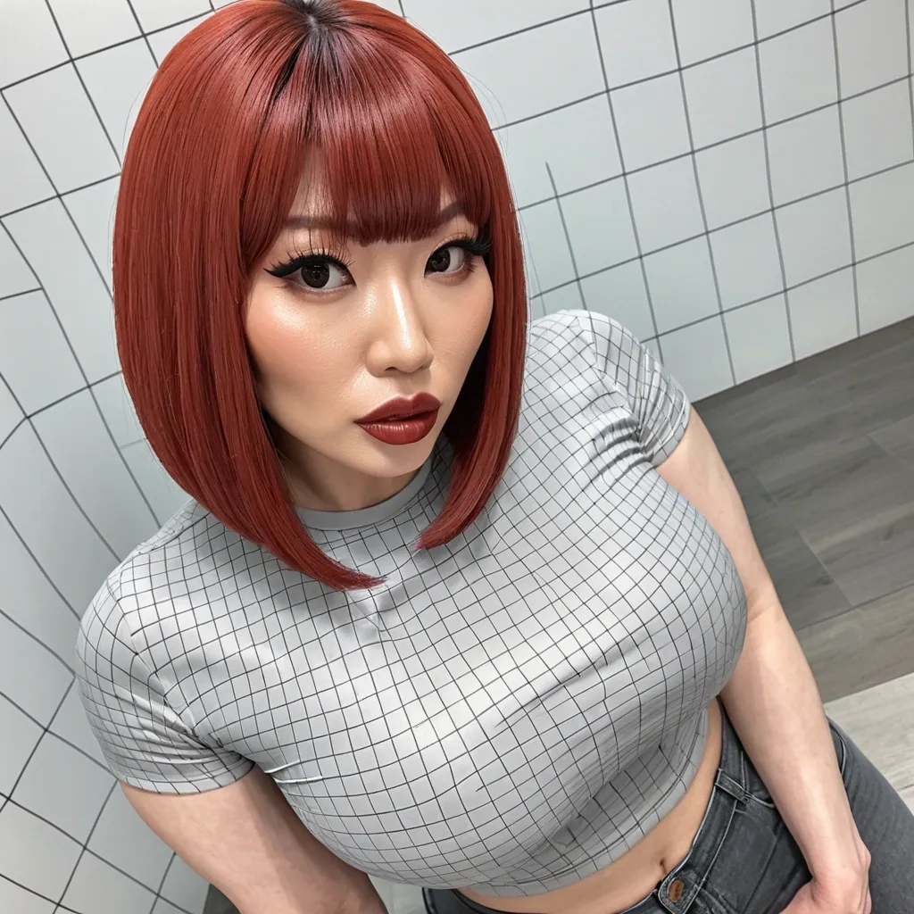 Generate Gorgeous female boss , 34 years old , Japanese woman , pointy face , bimbo , hourglass body , abnormally massive female bodybuilder , gorgeous , close up , full lips , big booty , red hair breast , short bob-cut , bangs cover forhead design hair , feminine silhouette , too big breast , big booty , sexy thighs abs , silhouette , up close , flexing biceps , beautiful green eyes , legs are iconic and defining physical feature , both visually and in terms of combat ability.wearing an outfit that is a striking blend of elegance , power , and femininity , designed to command attention in any room. The suit is tailored to perfection , hugging the wearer’s curves with precision while emphasizing a structured silhouette. The fabric itself is a refined grey tweed patterned with subtle white grid lines , giving the suit a texture that feels both sophisticated and modern. The blazer features broad blue lapels and gold button accents , adding a luxurious touch that elevates the look beyond typical business attire. The matching high-waisted trousers elongate the frame , further enhancing the poised and commanding effect of the ensemble.The styling choices amplify the boldness of the suit. The inner blouse is a silky , greybutton-down shirt that complements the tweed’s tone while introducing a softer , feminine balance to the sharp tailoring of the jacket. The blouse peeks out neatly from under the blazer , maintaining elegance without drawing focus away from the suit’s commanding cut. Accessories are kept minimal yet intentional: a delicate layered gold necklace and hoop earrings that add glimmers of light and luxury without overpowering the outfit. The choice oframes the face with both confidence and glamour , completing the commanding visual.Altogether , this look communicates a blend of authority and allure. It is business-ready yet fashion-forward , balancing corporate structure with vibrant femininity. The color palette blue , grey and gold avoids being overly delicate , instead embracing the richness of texture , structure , and presence. This is the kind of ensemble that speaks to ambition , sophistication , and personal style—ideal for someone who thrives in positions of influence but insists on expressing her individuality with bold elegance. It’s not just clothing—it’s a statement of power wrapped in grace. In luxury living legs that could crush a watermelon , skirt high boots are a bold and striking statement piece , crafted in glossy black patent leather that gives them a sleek , polished finish. Rising to just below the knee , the boots feature three adjustable buckle straps along the shaft , adding both edge and detail to their design. The towering stiletto heel , paired with a thick platform sole , creates an ultra-dramatic silhouette that elongates the leg and exudes power and confidence. With their combination of shine , height , and structure , these boots perfectly balance fierce femininity with high-fashion allure. Gorgeous brown eyes , big lips glossy lips , enormous breast , enormous butt , grey and white pattern grid designed t-shirt , gray denim jeans ,