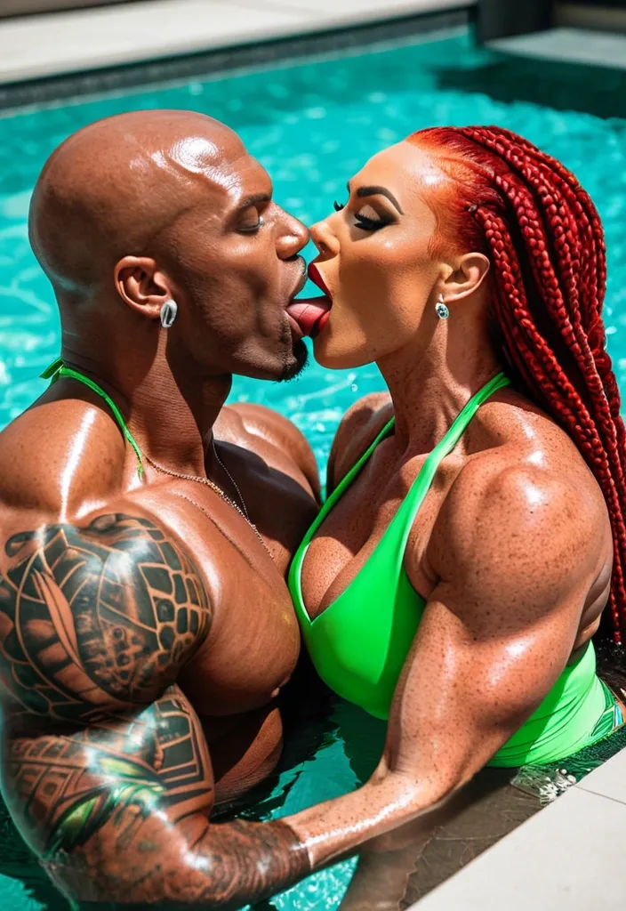 Generate Gorgeous female boss , bimbo , hourglass body , abnormally massive female bodybuilder , gorgeous , close up , full lips , big booty , redheaded , freckles on face and breast , braided design hair , feminine silhouette , too big breast , big booty , sexy thighs abs , silhouette , up close , flexing biceps , beautiful green eyes , legs are iconic and defining physical feature , both visually and in terms of combat ability.wearing an outfit that is a striking blend of elegance , power , and femininity , designed to command attention in any room. The suit is tailored to perfection , hugging the wearer’s curves with precision while emphasizing a structured silhouette. The fabric itself is a refined grey tweed patterned with subtle white grid lines , giving the suit a texture that feels both sophisticated and modern. The blazer features broad blue lapels and gold button accents , adding a luxurious touch that elevates the look beyond typical business attire. The matching high-waisted trousers elongate the frame , further enhancing the poised and commanding effect of the ensemble.The styling choices amplify the boldness of the suit. The inner blouse is a silky , greybutton-down shirt that complements the tweed’s tone while introducing a softer , feminine balance to the sharp tailoring of the jacket. The blouse peeks out neatly from under the blazer , maintaining elegance without drawing focus away from the suit’s commanding cut. Accessories are kept minimal yet intentional: a delicate layered gold necklace and hoop earrings that add glimmers of light and luxury without overpowering the outfit. The choice of voluminous , honey-brown braids cascading down her shoulders frames the face with both confidence and glamour , completing the commanding visual.Altogether , this look communicates a blend of authority and allure. It is business-ready yet fashion-forward , balancing corporate structure with vibrant femininity. The color palette blue , grey and gold avoids being overly delicate , instead embracing the richness of texture , structure , and presence. This is the kind of ensemble that speaks to ambition , sophistication , and personal style—ideal for someone who thrives in positions of influence but insists on expressing her individuality with bold elegance. It’s not just clothing—it’s a statement of power wrapped in grace. In luxury living legs that could crush a watermelon , skirt high boots are a bold and striking statement piece , crafted in glossy black patent leather that gives them a sleek , polished finish. Rising to just below the knee , the boots feature three adjustable buckle straps along the shaft , adding both edge and detail to their design. The towering stiletto heel , paired with a thick platform sole , creates an ultra-dramatic silhouette that elongates the leg and exudes power and confidence. With their combination of shine , height , and structure , these boots perfectly balance fierce femininity with high-fashion allure. Green 1 piece swimsuit sitting in jacuzzi , enormous tongue kissing , French kissing long tongue , next to muscular bald headed muscular African-American man wearing swim trunks ,