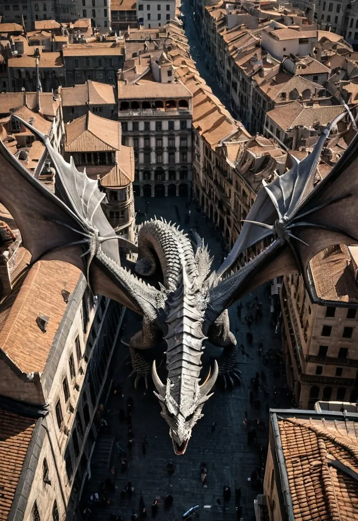 A massive dragon glides low above a dense historic city , its enormous wings stretching across the frame as it passes between tightly packed buildings. The view is from high above , looking down toward a busy plaza surrounded by ornate stone architecture. Streets radiate outward from the square , lined with weathered rooftops , balconies , and narrow alleys. The dragon dominates the composition. Its body is long and muscular , covered in rugged gray scales that catch the sunlight along the ridges of its spine. Large horns curve outward from its head , and rows of smaller spikes run down the back of its neck. Its wings are broad and leathery , with pale , sunlit membranes stretched between dark structural bones. The wings cast sweeping blurry shadows across rooftops and the open square below. ,