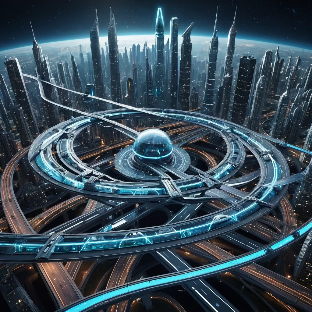 A quantum-entangled cityscape with roads that make loopings where miniature alien spaceship float amidst while the rotating rail-track in space with artificial gravity , 30th century orbital space-train running on interconnected by bioluminescent helium track , skyscrapers built on multi layer triangles surface with opposite side visible as sky , parks and buildings in curved perspective , space-train docking at central hub with impossible geometries. 6-35mm wide-angle lens , f/8-f/11 deep focus , photo-realistic curved architecture , surreal gravity effects , ,