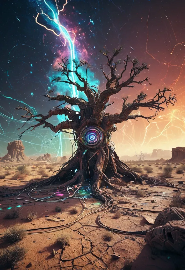A colossal , ancient tree emerges from a cracked , arid desert floor with glowing electrical cables and colorful wired electrical branches , cyberpunk , sci-fi , fantasy , its roots intertwined with remnants of forgotten technology. The sky above is a swirling vortex of cosmic dust and distant nebulae , hinting at a universe where nature reclaims the artificial. Rendered in a gritty , textured digital art style , reminiscent of concept art for a post-apocalyptic sci-fi epic. ,