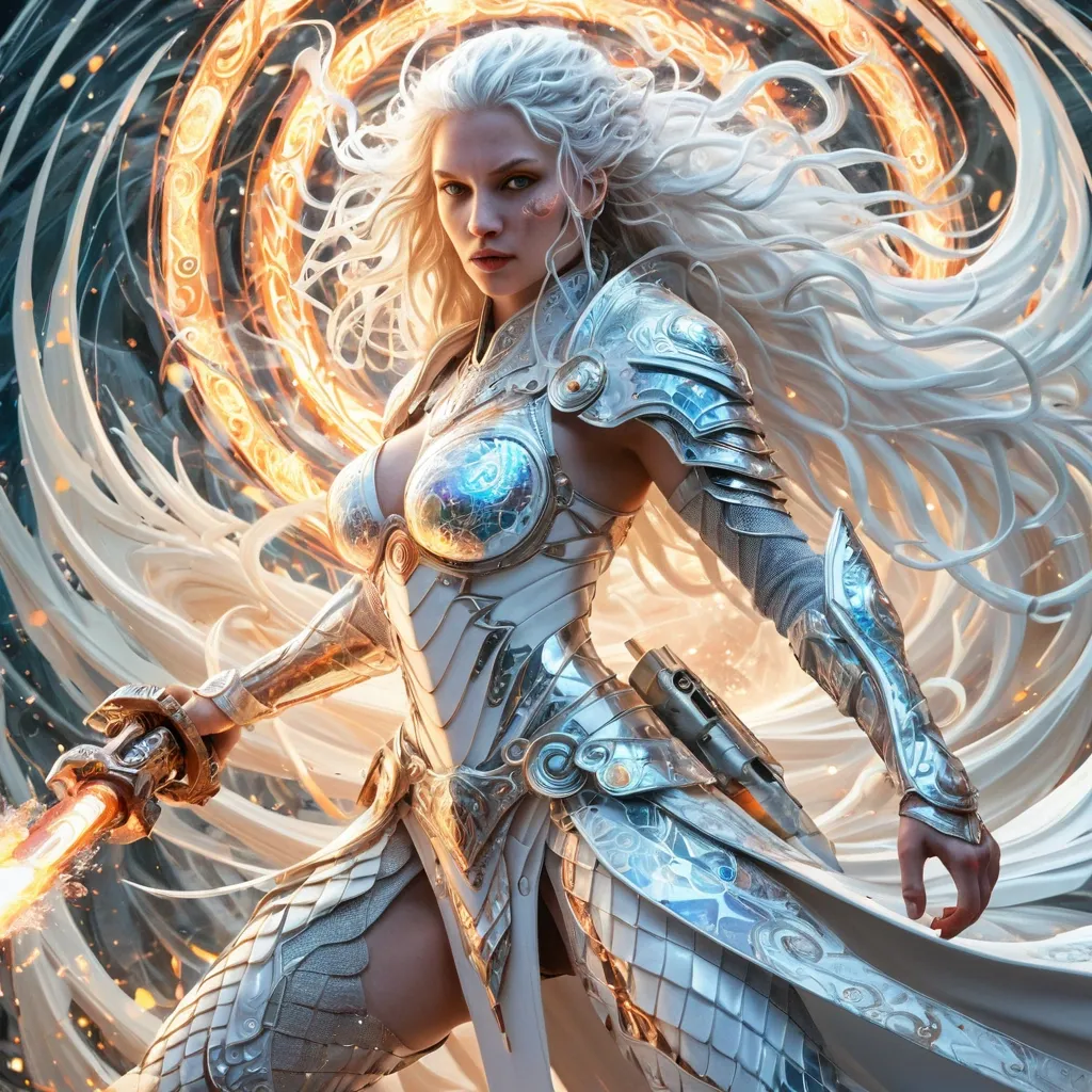 A Gorgeous female warrior , with long flaming wavy hair , mythical Excalibur and a massive mini-gun with gleaming barrels with intricate geometric patterns and iridescent shimmers , gracefully navigating through a swirling of fierce albino white dragon depicted in an Abstract graphic Interference style , with swirling dot lines patterns and dynamic light motion speed effects. The dots elements should create a sense of movement and energy. Employ a white color palette of sapphire white with iridescent shimmer. Full body shot from a low vantage point. dragon in the frame. ,