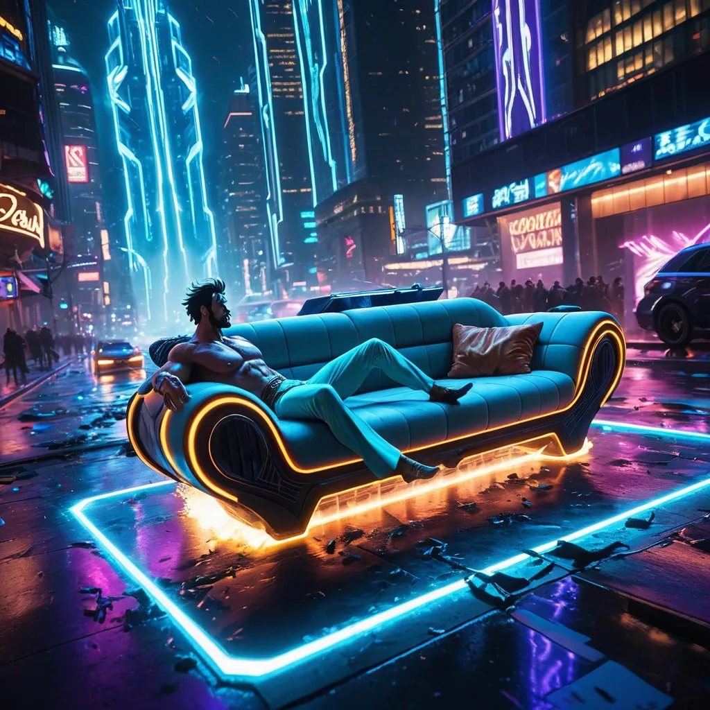 Cinematic neon-lit action scene over skyscraper street at night. A futuristic setting. 880 meets 1380 with a futuristic stage couch that hovers without wheels (no-wheels) , (a 2019 musical fantasy film and a live-action adaptation of Disney's 1992 animated film 'Aladdin') Aladdin sit on and enjoy hookah , drifting sideways at high speed , couch's edge generating sparks and smoke. Strong motion blur , glowing cyan underglow , dramatic reflections on the couch body , and intense rim lighting. Camera angle is top and dynamic , hover to the ground , capturing the drift arc and flying debris. Hyper-stylized realism with anime-inspired lighting , sharp highlights , and deep shadows. ,