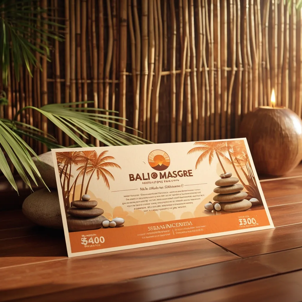 A realistic , funky Bali massage voucher template in landscape orientation , placed on a natural wooden surface. The design feels relaxing , tropical , and warm , with earthy and golden tones — terracotta , amber , beige , and soft orange. Layout includes a title (“Bali Massage Voucher”) , space for recipient name and value , and the Balinesse Spa logo in a subtle , elegant placement. Background shows realistic natural textures — wood , woven bamboo , or soft palm leaf shadows. Add Balinese spa elements like candles , soft towels , and palm leaves , with gentle sunlight for a warm , calming feel. Use soft depth of field , natural shadows , and ambient tropical lighting for realism. The final composition should look like a high-quality product photo — warm , tranquil , and professionally styled. Recommended settings: Model: Realistic Vision V6.0 or DreamShaper XL Aspect ratio: 16:9 (landscape) Quality: High or Ultra Style: Photorealistic Lighting: Soft natural sunlight ,