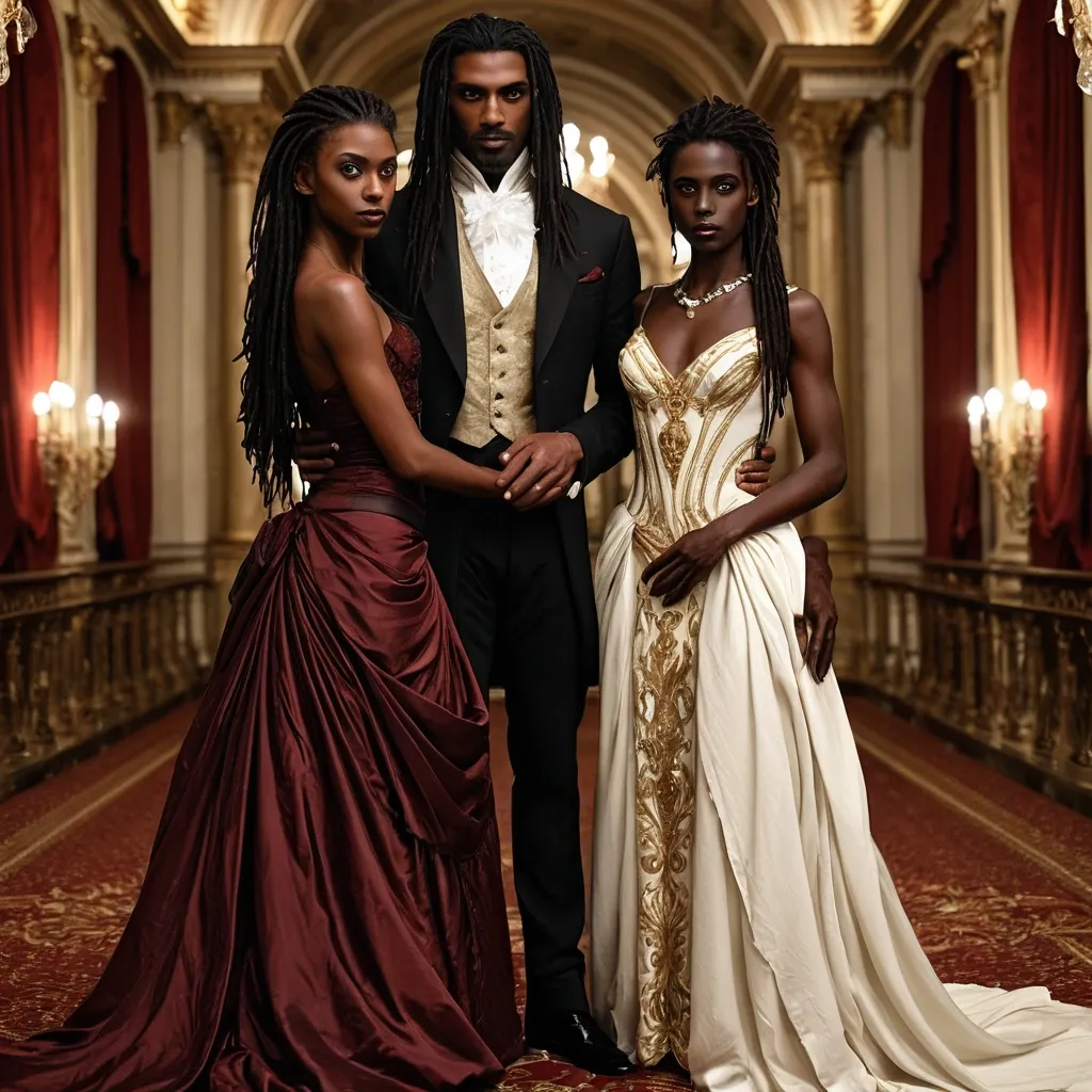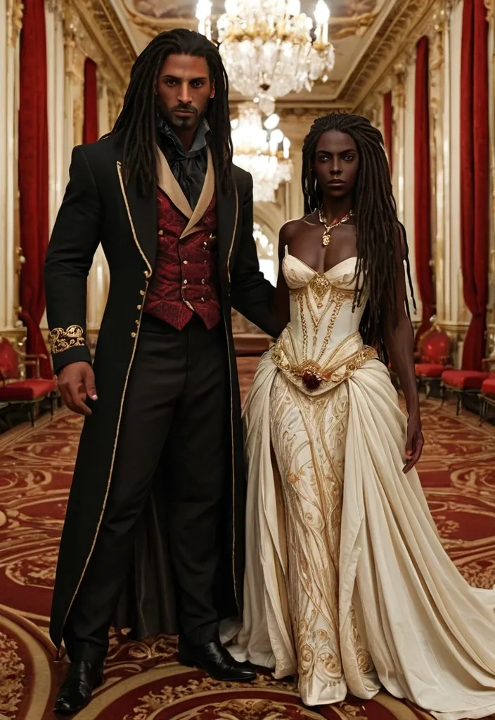 Aidan: Alfa lobisomem forte , elegante , imponente , 25-35 anos (cada era) , pele escura , dreadlocks , olhos penetrantes lupinos , olhar intenso , protetor , inspira respeito. Liaandra: Vampira esbelta , elegante , graciosa , 25-35 anos (cada era) , pele escura , dreadlocks longos escuros , olhos marcantes cativantes tom avermelhado , confiança silenciosa , sofisticação. 1: 1º Encontro (1905): Baile Viena luxuoso , olhares cruzam , Liaandra (vestido deslumbrante) , Aidan (traje formal) , valsa. Detalhes: Salão opulento , vestidos elegantes. Cores: Dourados , vermelhos , brancos cremosos. ,