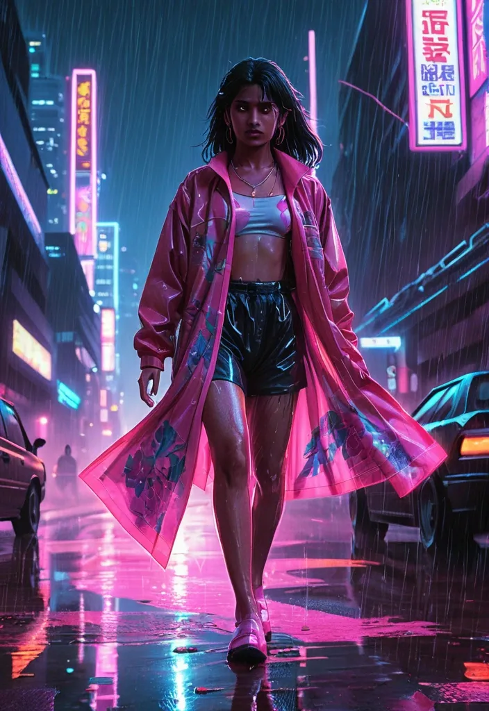 1980's Anime Style , Synthwave album cover , a lone indian woman wearing a sleek transperent raincoat over floral pink saree strides through the neon-reflected puddles of a midnight downpour , her long hair whipping in the wind. The city hums behind her , blurred by rain , but her sharp gaze locks onto something—or someone—just beyond the frame , expression arrogant streetwise smart tough tomboy as she stairs off into the distance , background is a neon illuminated futuristic cyberpunk cityscape , highest quality , 4k , HDR , AirBrush , horizontal plane of camera is offset 30 degrees giving the image a tilted artbook look , ,