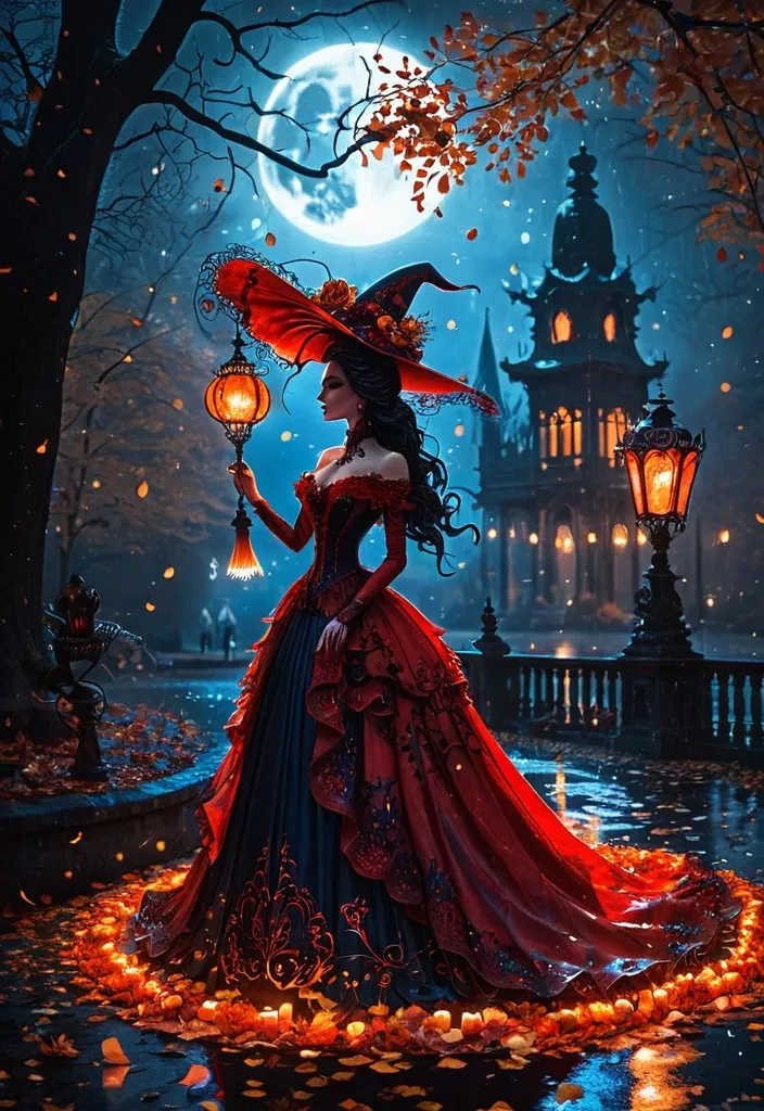 A captivating and dramatic digital painting featuring the silhouette of a witch in an elegant red and dark , ornate , lavish Victorian-style dress , her hat is very special standing with her s outstanding noble Witch's broom near to an elaborately decorated old Temple with floral decorations. The background is a striking contrast of dark blue and bright red , creating a mysterious and romantic mood. The woman , holding a noble lantern , is surrounded by large , vibrant halloween decorations , autumn leaves gently falling around her , emphasizing the elegance of the scene. Soft rays of light break through the darkness , illuminating the contours of her figure and highlighting the surrounding flowers. The overall composition is balanced , with the decorations forming a vibrant foreground against a more muted background. The artwork showcases an abstract style that blends impressionistic elements with bold colors , creating a sense of movement and emotion. The contrast of light adds depth , casts subtle shadows , and enhances the atmosphere of the work. This artwork is ideal for expressing themes of love and intrigue , conveying a sense of calm amidst the chaos of falling leaves , floating fog glowing from sunbeams in the rain and glows the dress of the beauty woman , candlelight giving a mystical scene , raindrops giving magical reflections and the Moon is shimmering a little through the rain ,