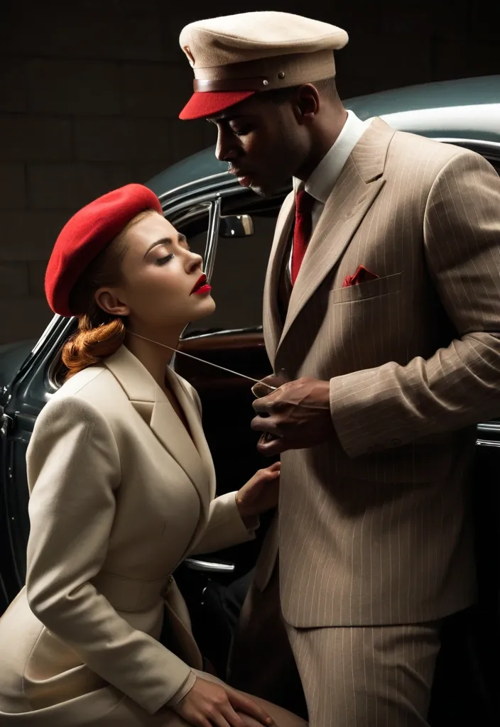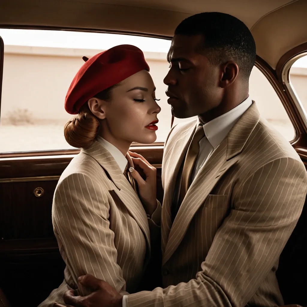 They’re in the back of a luxury , futuristic-1940s-style vehicle , and the air between them is thick enough to cut with a knife. She leans in close—too close for business , just close enough to make a man reconsider his loyalties. As a stunning Caucasian woman , her features are sharp and polished: porcelain skin , sculpted cheekbones , a refined jawline , and lips painted in a bold , commanding red. Her hair is pinned into a smooth , vintage roll beneath a beige beret , giving her that dangerous blend of elegance and authority. Every inch of her posture whispers control. She isn’t touching him by accident; she’s reminding him who sets the rhythm here. He sits firm , unmoving—a powerful African-American man in a perfectly tailored pinstripe suit that clings to his strength instead of hiding it. His expression is carved from stone , all discipline and simmering tension. The beige fedora shadows his eyes just enough to add mystery , but not enough to hide the calculation behind them. His broad shoulders and sharp posture make it obvious he’s used to being the threat in the room… yet right now , he’s letting her get inches from his mouth. Letting , not yielding. Her hand rests on his tie—not soft , not hesitant , but deliberate. She’s testing him , warning him , and reminding him exactly who she is without raising her voice. Those long fingers are poised with the calm of someone who could straighten a man’s collar or tighten a noose with the same steady grace. Her expression is cold but alluring , her eyes half-closed as if savoring the power of being this close to a man who could crush her—and yet won’t. Not unless she commands it. The lighting inside the car finishes the story. Shadows sculpt their faces , tracing every angle , every tension line , every unspoken threat. The cream , beige , and gold tones of their clothing tie them together visually , but not emotionally—this is a collision of dominance and defiance. She’s the elegant blade; he’s the iron wall. Together they create a moment that’s intimate , dangerous , and charged with the kind of energy that leaves a man swallowing his pride and a woman smirking as she walks away. ,