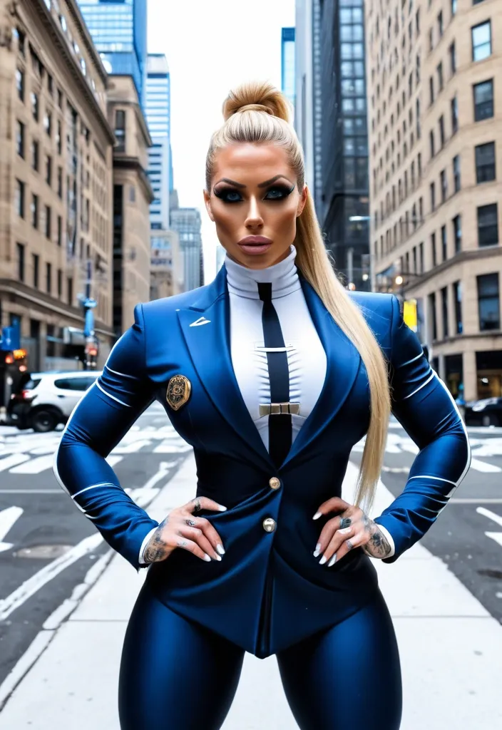 Generate Gorgeous female boss , bimbo , hourglass body , abnormally massive female bodybuilder , gorgeous , close up , full lips , big booty , blonde , hair in ponytail bun , , feminine silhouette , too big breast , big booty , sexy thighs abs , silhouette , up close , flexing biceps , beautiful oval blue , legs are iconic and defining physical feature , both visually and in terms of combat ability.wearing an outfit that is a striking blend of elegance , power , and femininity , designed to command attention in any room. The suit is tailored to perfection , hugging the wearer’s curves with precision while emphasizing a structured silhouette. The fabric itself is a refined grey tweed patterned with subtle white grid lines , giving the suit a texture that feels both sophisticated and modern. The blazer features broad blue lapels and gold button accents , adding a luxurious touch that elevates the look beyond typical business attire. The matching high-waisted trousers elongate the frame , further enhancing the poised and commanding effect of the ensemble.The styling choices amplify the boldness of the suit. The inner blouse is a silky , greybutton-down shirt that complements the tweed’s tone while introducing a softer , feminine balance to the sharp tailoring of the jacket. The blouse peeks out neatly from under the blazer , maintaining elegance without drawing focus away from the suit’s commanding cut. Accessories are kept minimal yet intentional: a delicate layered gold necklace and hoop earrings that add glimmers of light and luxury without overpowering the outfit. The choice of voluminous , honey-brown braids cascading down her shoulders frames the face with both confidence and glamour , completing the commanding visual.Altogether , this look communicates a blend of authority and allure. It is business-ready yet fashion-forward , balancing corporate structure with vibrant femininity. The color palette blue , grey and gold avoids being overly delicate , instead embracing the richness of texture , structure , and presence. This is the kind of ensemble that speaks to ambition , sophistication , and personal style—ideal for someone who thrives in positions of influence but insists on expressing her individuality with bold elegance. It’s not just clothing—it’s a statement of power wrapped in grace. In luxury living legs that could crush a watermelon , skirt high boots are a bold and striking statement piece , crafted in glossy black patent leather that gives them a sleek , polished finish. Rising to just below the knee , the boots feature three adjustable buckle straps along the shaft , adding both edge and detail to their design. The towering stiletto heel , paired with a thick platform sole , creates an ultra-dramatic silhouette that elongates the leg and exudes power and confidence. With their combination of shine , height , and structure , these boots perfectly balance fierce femininity with high-fashion allure. Gorgeous big oval shaped eyes , pointy face , futuristic black , blue and white chief of police sports coat and tie , with matching shirt , gold police badge on right chest , turtleneck , full body shot out in the city ,