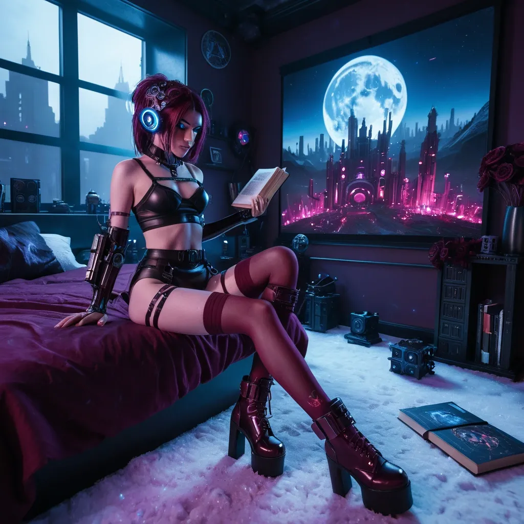 Fashionable burgundy battalion-style heels and burgundy stockings worn by a beautiful cyborg with mechanical details and neon eyes , holding a book and looking at it while sitting on a bed with her hand in her hair. The bedroom features burgundy flowers , a burgundy planet , a burgundy moon visible through the window , and wisps of burgundy smoke. Dark Cyberpunk aesthetic with cosmic , progressive industrial elements , ice fractal fog , and liquid nitrogen. Cinematic lighting with Minecraft-inspired highlights and a gradient color scheme of white , blue-black , and deep blue. 8k HDR professional photo , subject focus on the body , with background elements of a tank top , midriff , knee-high leg warmers , stripped side ties , and bare feet. A fashionable cyborg with mechanical enhancements and neon eyes , wearing battalion-style burgundy heels , burgundy stockings , and a midriff-baring tank top , sits on a bed in a dark , cosmic Cyberpunk city bedroom. Burgundy smoke and flowers surround the scene , with a burgundy planet and moon visible in the background. The cyborg holds a book , looking at it intently , with one hand in their hair. The lighting is inspired by Minecraft , with a gradient of white , blue-black , and deep blue , creating an 8k HDR , Monumental , dark fantastic atmosphere. Photorealistic style , with sharp focus on the body. ,