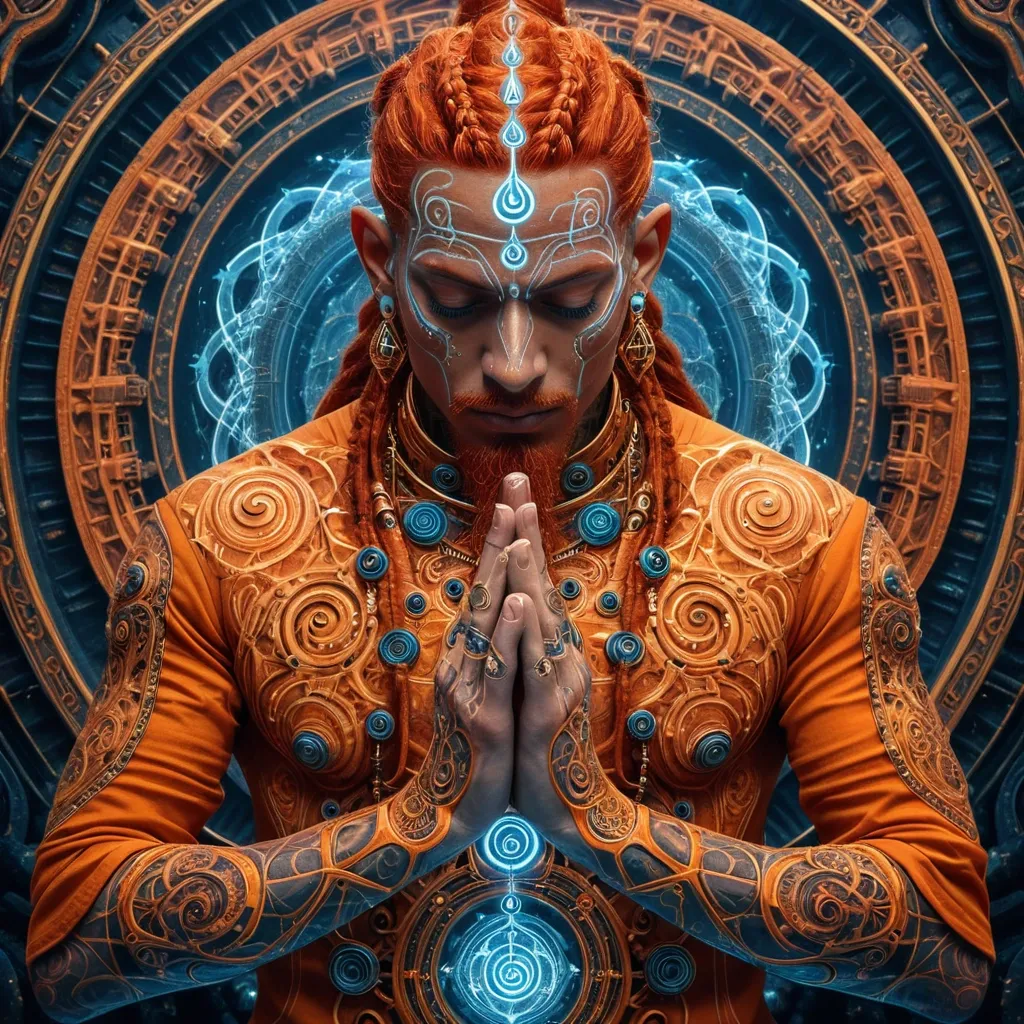 A futuristic vision of a fusion of Escher and Dali styles made of Tendrils , an crystalline ancient Indian monk with braided red hair , intricate "ॐ" symbol made as a tattoos on his skin , wearing futuristic orange cloths. his hands are clasped together in prayer , with a dystopian temple in the background , intricate fractal filigree patterns covering skin and fur in gold and sapphire blue , ultra-detailed ornate baroque style , mandala elements , psychedelic baroque , luxury cosmic aesthetic , deep blues and golds , cinematic lighting , hyper-detailed. ,