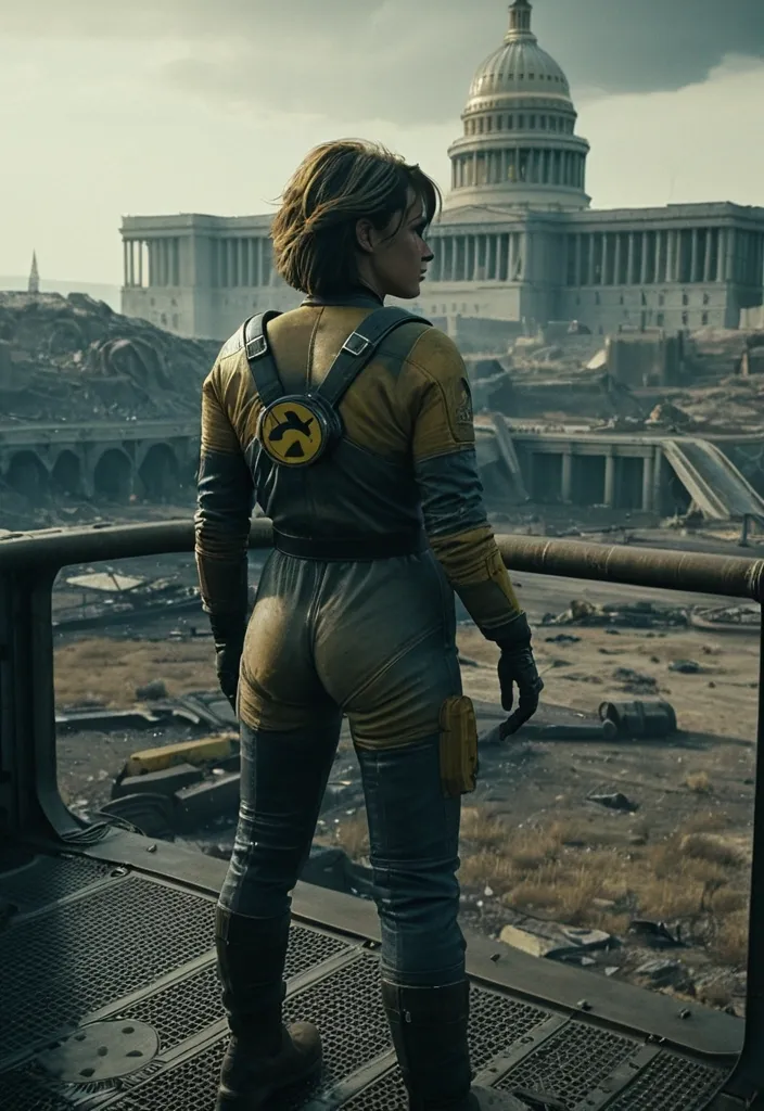 From behind A mature woman in a Vault-Tec jumpsuit strong thighs on the deck of a massive airship "pridwen" , overlooking the desolate ruins of the Capitol Building. Cinematic film still , shot on v-raptor XL , with visible film grain and a subtle vignette. The scene is color graded and post-processed with dramatic , cinematic lighting that accentuates the atmospheric , post-apocalyptic landscape. Shot on 35mm film , evoking a sense of epic , stunning , live-action realism as a masterpiece. ,