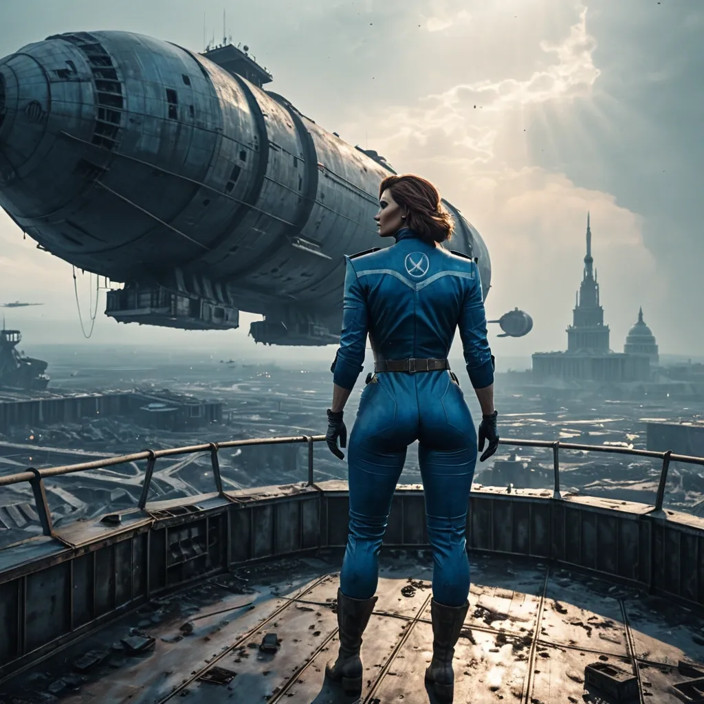 From behind of A classic Fallout Vault Girl , dressed in blue jumpsuit showing strong thighs , stands on the deck of a massive , retro-futuristic zeppelin , light shining on her back. She is gazing out at the sprawling , ruined Pentagon of the US Capital Wasteland below. The scene is depicted in a gritty , post-apocalyptic concept art style , with dramatic , atmospheric cinematic lighting and a desolate , muted color palette , evoking the style of Marek Denko and Sparth. The airship's weathered metal gleams under a hazy , polluted sky , with embers and smoke rising from the ruins. Cinematic film still , shot on v-raptor XL , film grain , vignette , color graded , post-processed , 35mm film , live-action , best quality , a masterpiece , epic , stunning , dramatic. ,