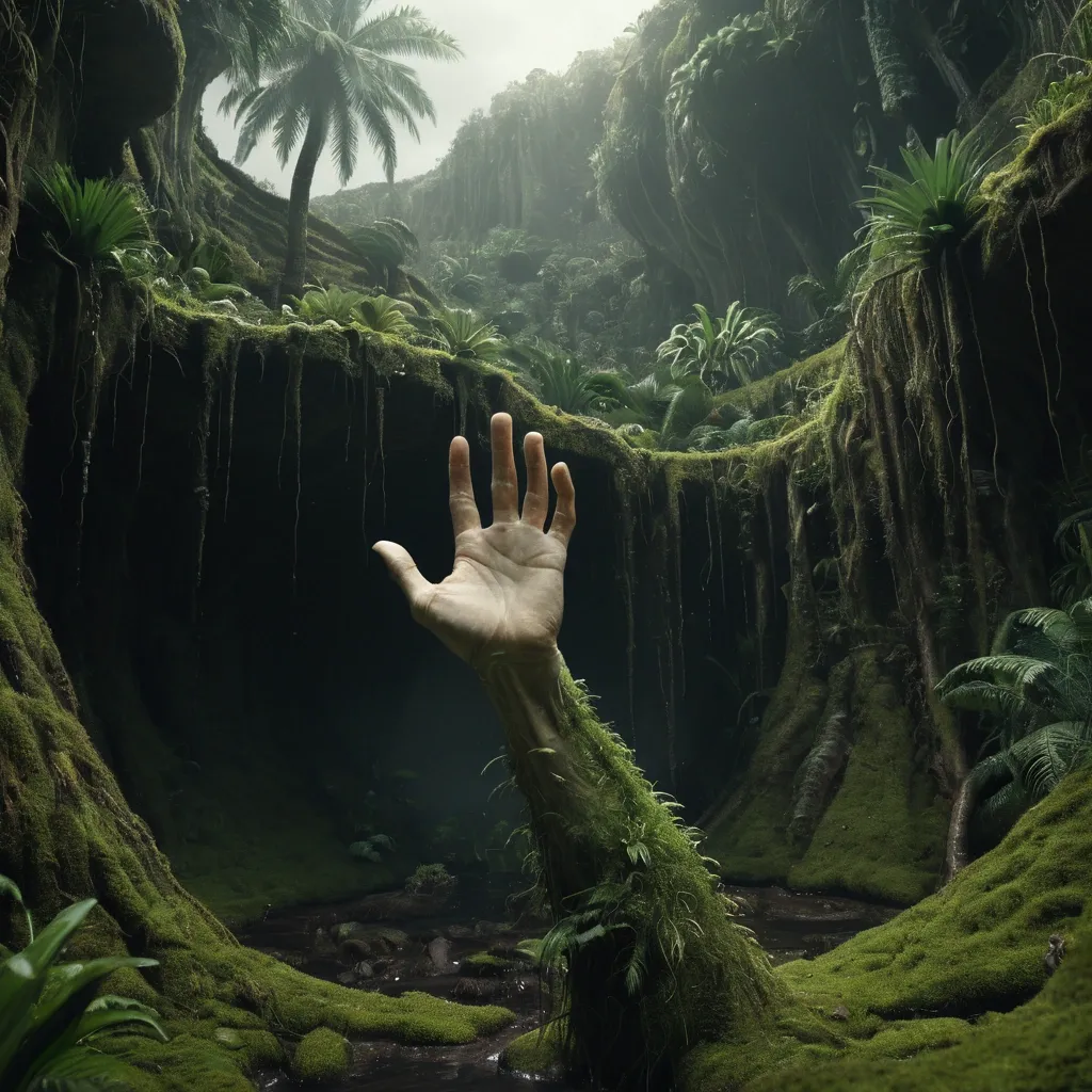 surreal environmental scene where a human arm rises naturally upward from the ground , arm extended vertically and wrist gently bent so the palm faces horizontally like a landscape plateau , the palm fully transformed into natural terrain , skin seamlessly becoming soil , moss , roots and vegetation , where a single transitions into a waterfall that fall from and fills the structure of the garden in a Interference style , total organic fusion between hand and ecosystem , the hand elevated but clearly attached to a real arm and body below frame , not floating , photorealistic textures , cinematic lighting , soft natural atmosphere , environmental concept art , magical realism , ultra detailed , wide shot , depth , 8k ,